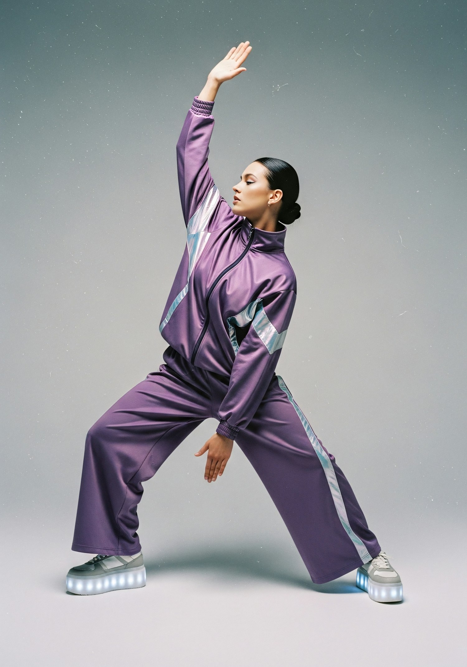 A person in a purple tracksuit and glowing platform shoes strikes a dynamic pose against a gray background.