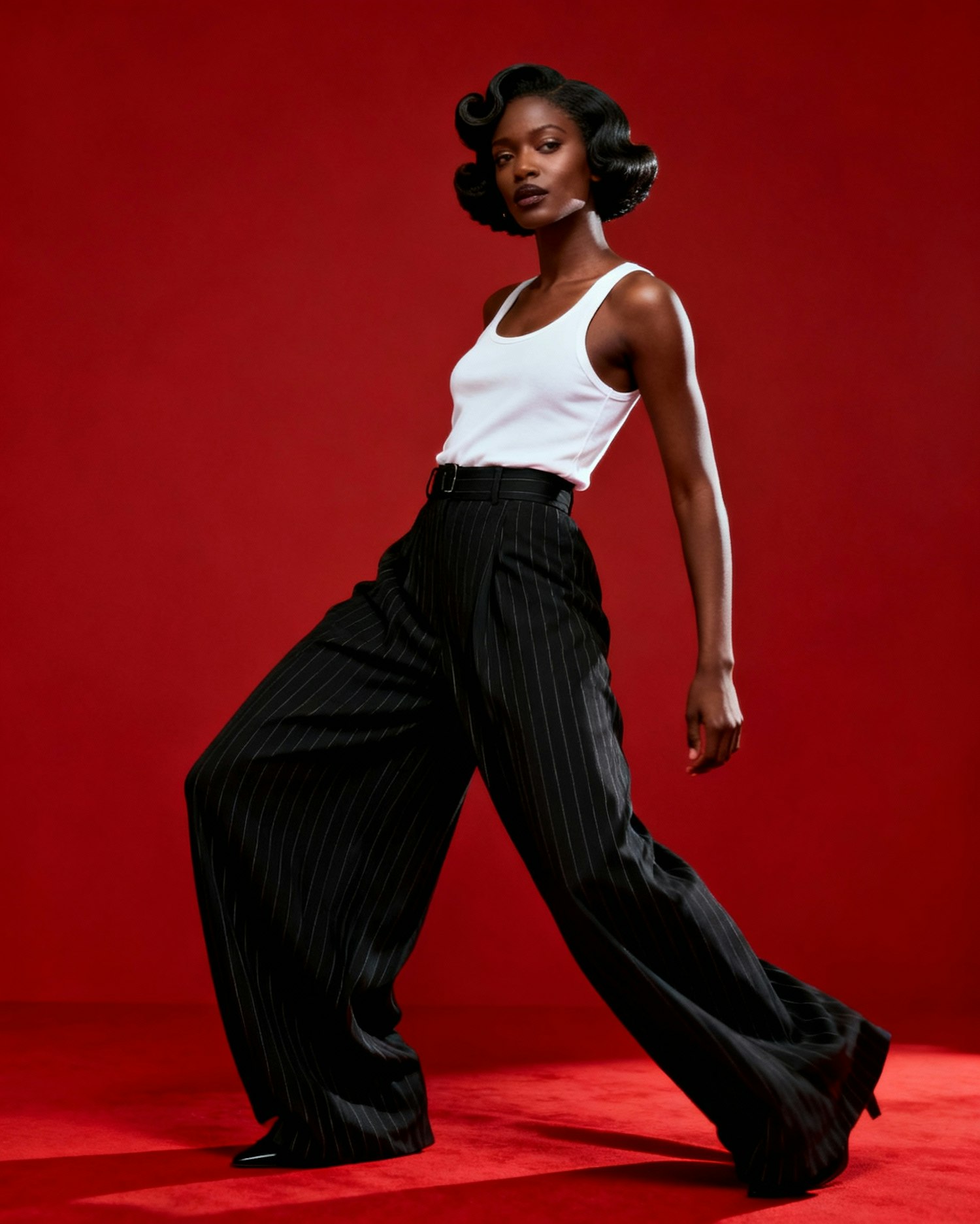 Full-body, ultra-high-definition portrait of a stylish Black woman standing on a bold red surface, her body angled in a dynamic pose that suggests motion and intent. She wears a crisp white tank top tucked into wide black pinstriped pants that flow with subtle movement. Her hair is styled in short finger waves, adding vintage elegance to her modern silhouette. The red background is rich and saturated, enhancing the contrast between her outfit and the scene’s emotional intensity. Lighting is soft and directional, casting sculptural highlights across her skin and garment. The overall mood is editorially fierce, culturally resonant, and visually rhythmic—ideal for a Gen Z fashion portrait or Afro-fusion identity showcase that celebrates motion, contrast, and creative authority.