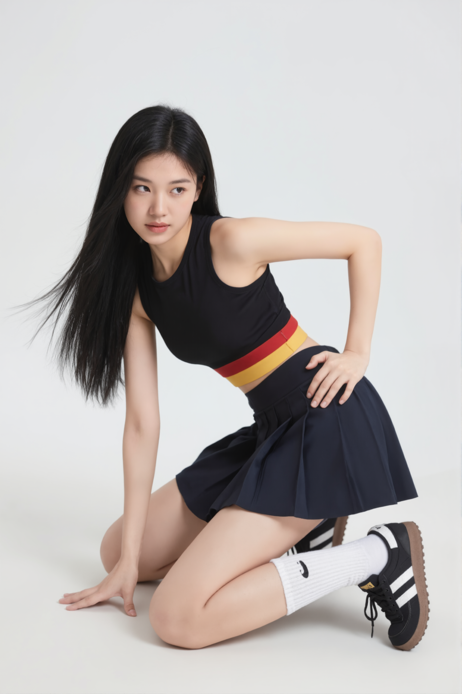 Stylish young woman in a sporty outfit kneeling in a dynamic pose, wearing a black top, pleated skirt, and sneakers on a white background.