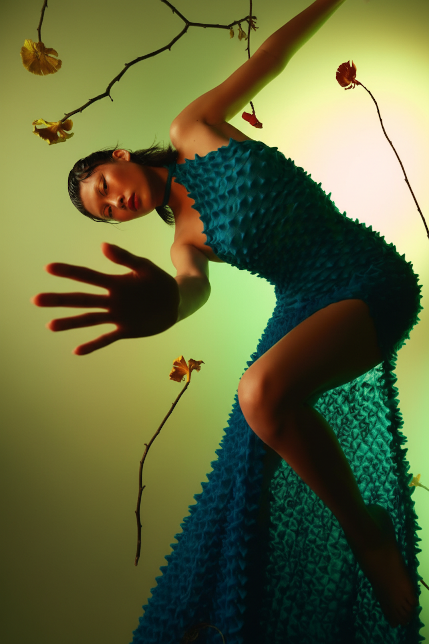 A woman in a textured blue dress poses dynamically against a greenish background with branches and flowers, creating an artistic composition.