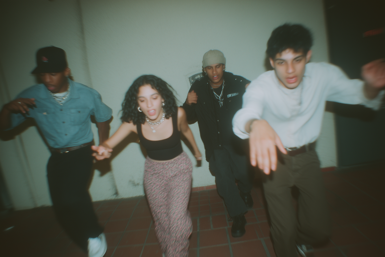 Four young adults in trendy outfits captured mid-motion, creating a dynamic and energetic vibe in an urban setting.