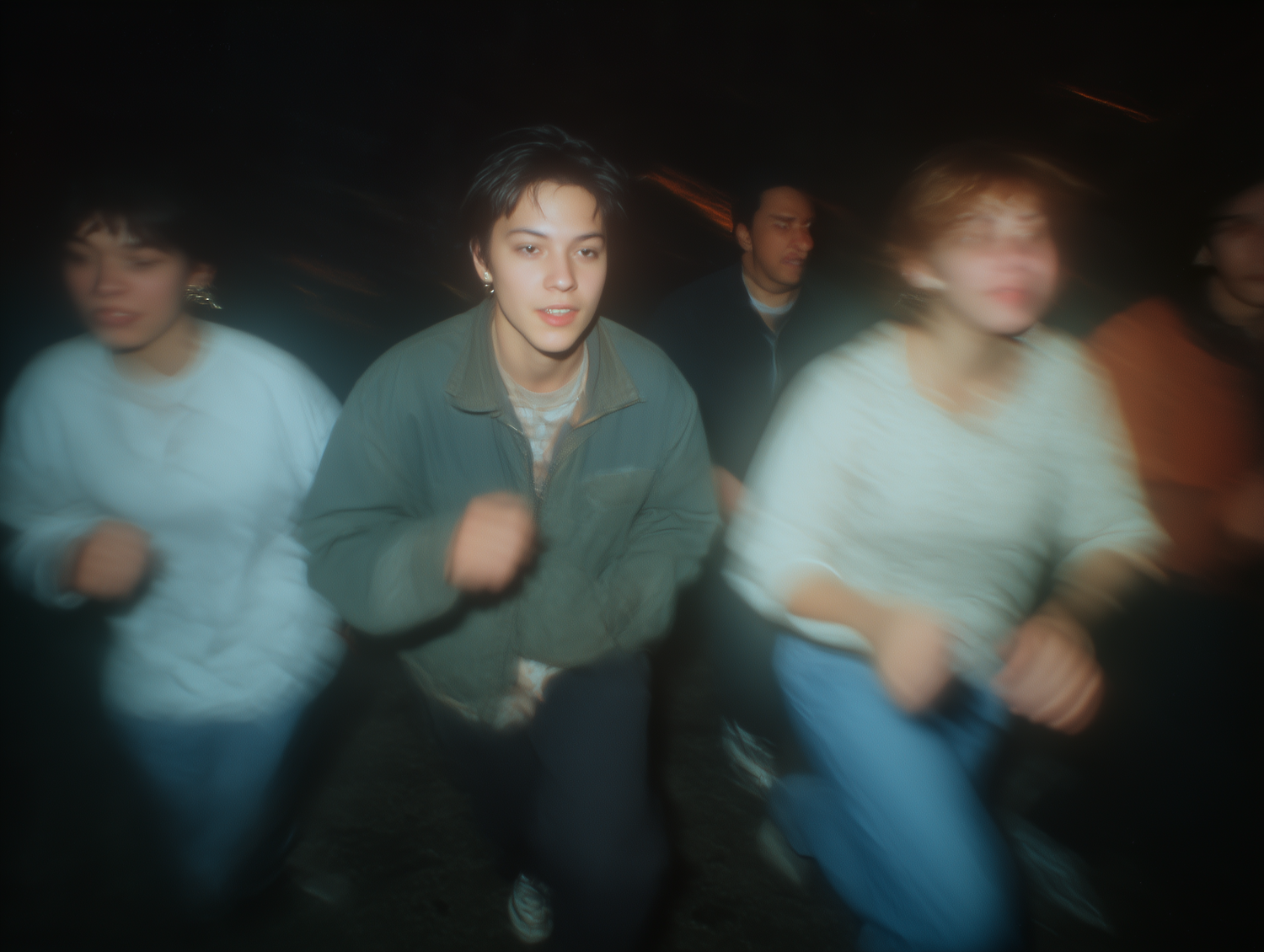 A group of young adults in motion, with a central figure in focus wearing a green jacket, set against a dim, blurred background.