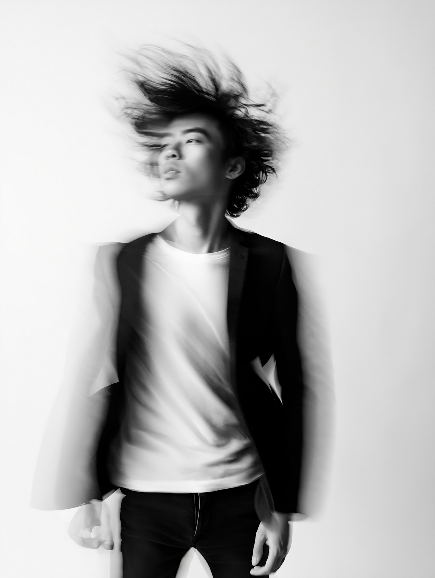 Dynamic black-and-white portrait of a person in motion, with blurred hair and a stylish outfit against a plain background.