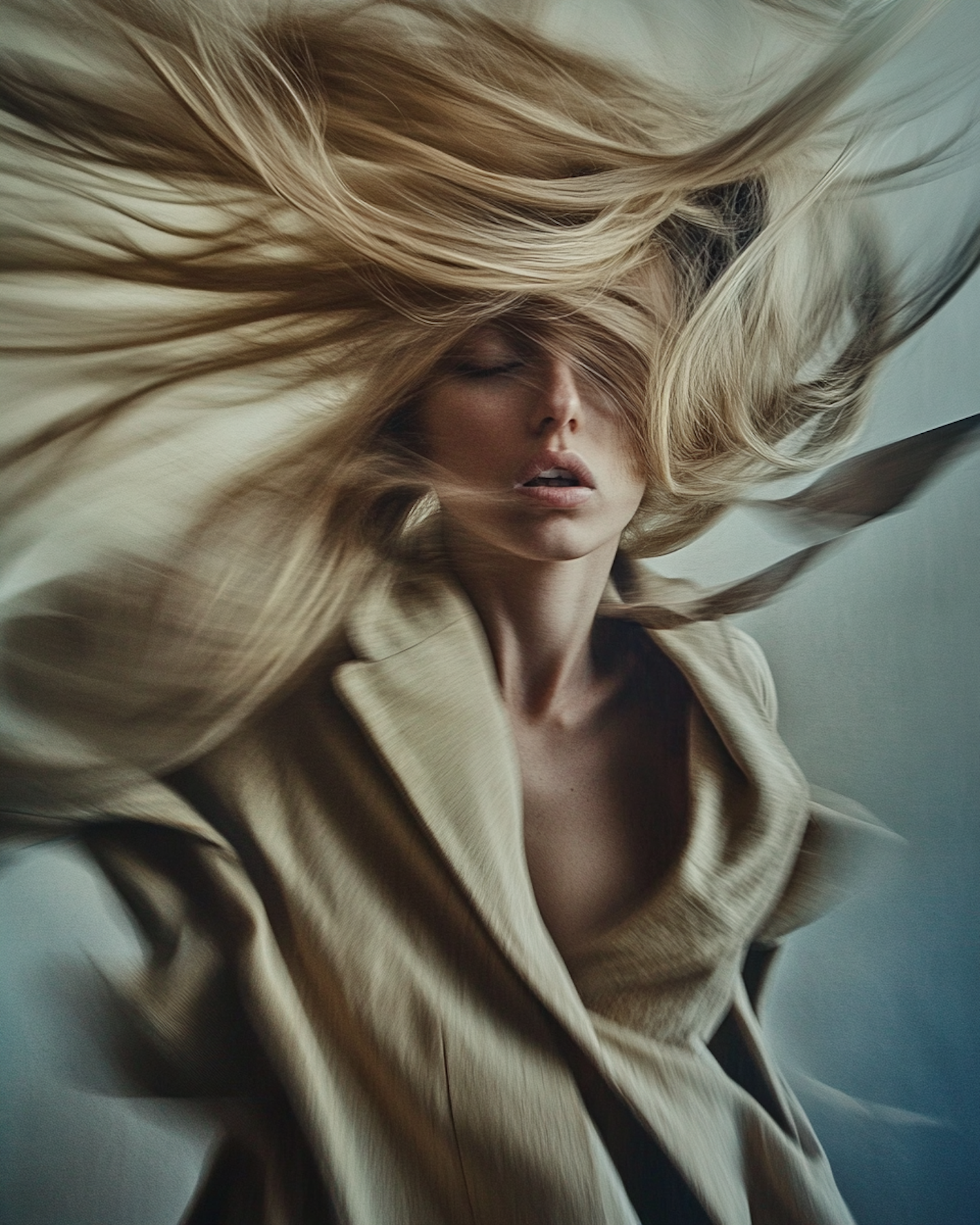 A striking portrait of a woman with flowing blonde hair in motion, wearing a beige blazer, set against a softly blurred background.