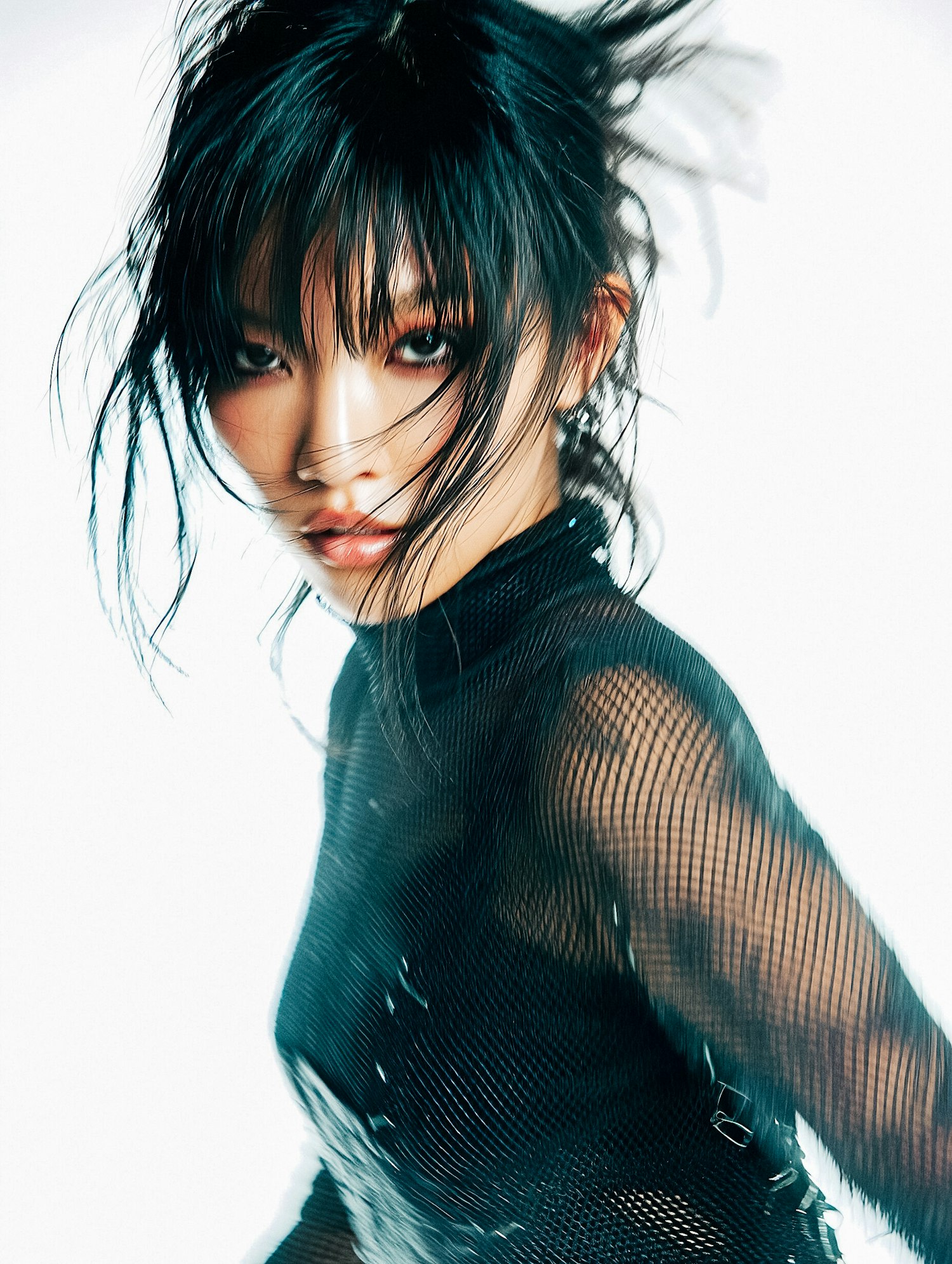 Dynamic portrait of a woman with tousled black hair and bold makeup, wearing a textured black top against a bright background.