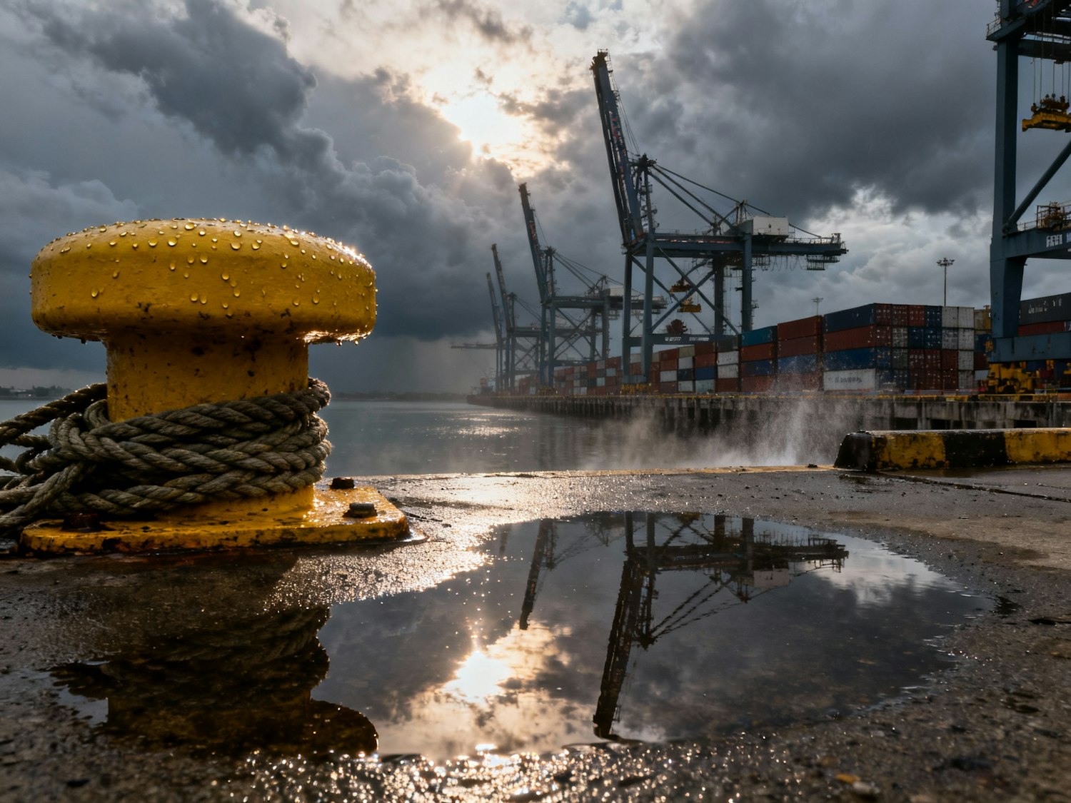 Harbor pier right after a coastal squall, heavy yellow bollard and thick mooring lines in the foreground on rain-wet concrete, sun beam from a cloud gap lighting water beads on the metal; behind, container stacks and working gantry cranes along the terminal edge; puddle near the bollard reflecting part of the crane structure and sky; faint spray blowing in from the basin. 24 mm, f/7.1, ISO 100, 1/250 s; circular polarizer used to control reflections on wet metal and nearby puddles — do not over-rotate. Negative: gray haze left uncorrected, over-clarity on ropes, halo edges around structures, metallic color shifts.