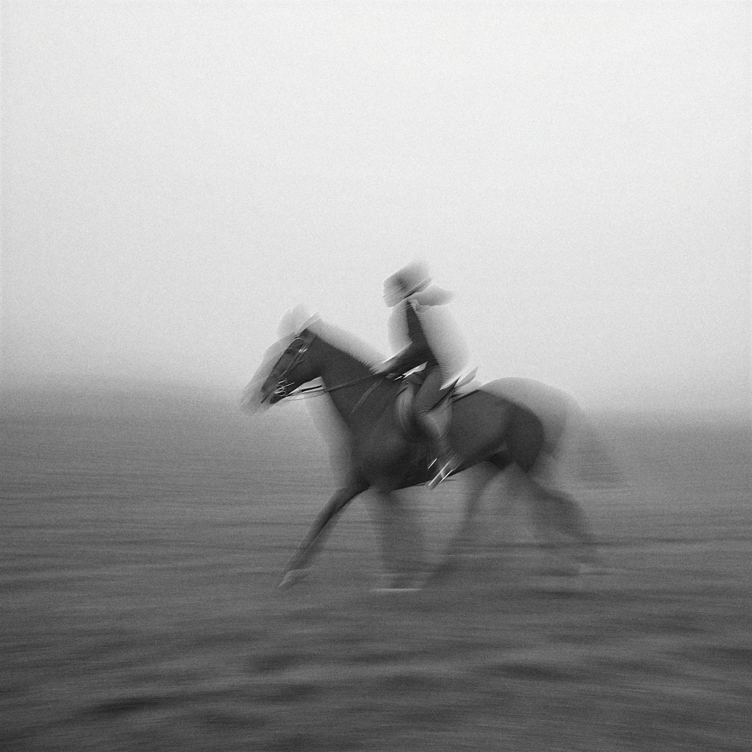 A dynamic black-and-white image of a rider on a galloping horse, captured with motion blur for an artistic and energetic effect.