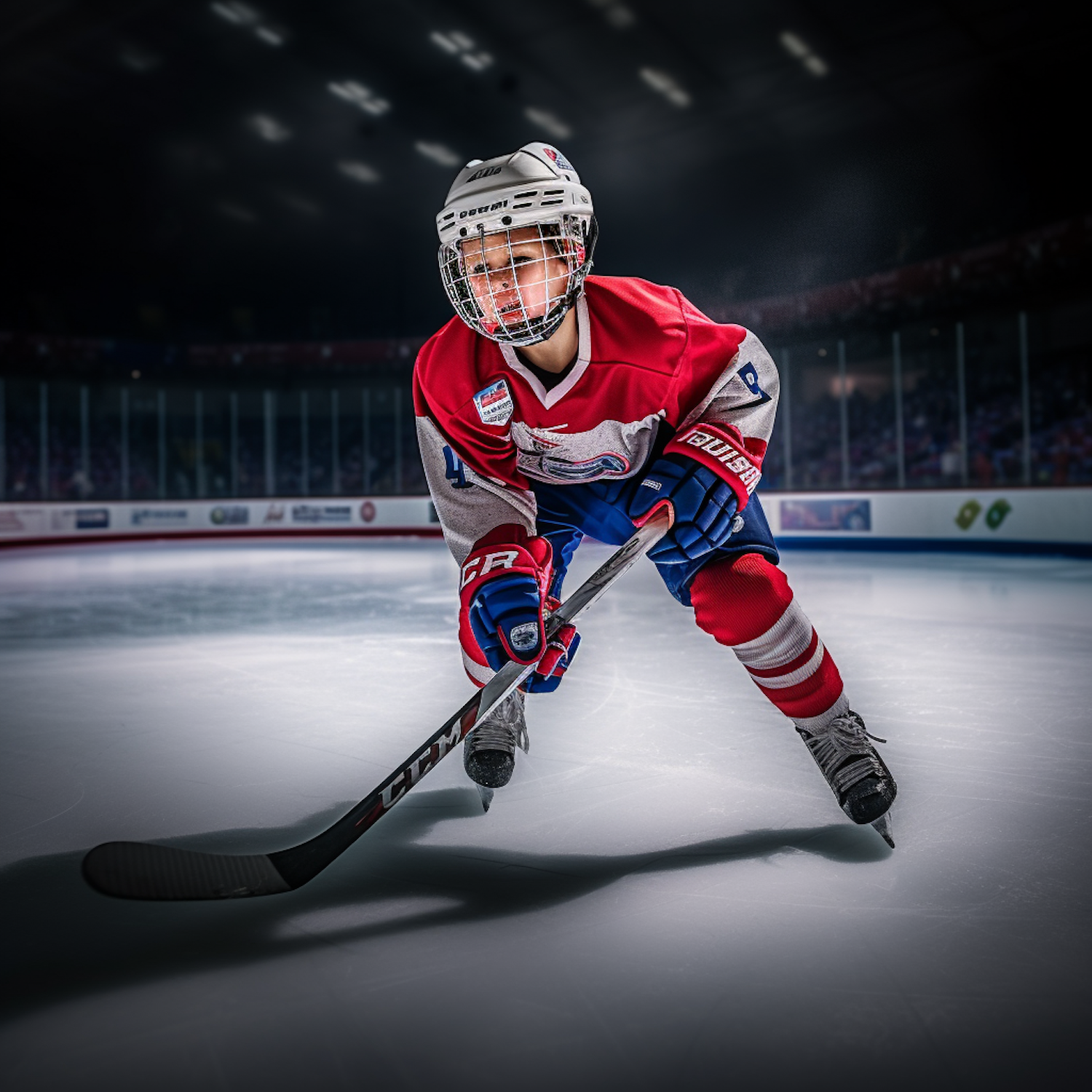 Young hockey player in action on the ice, wearing red and white uniform, helmet, and gloves, with a dynamic skating pose.