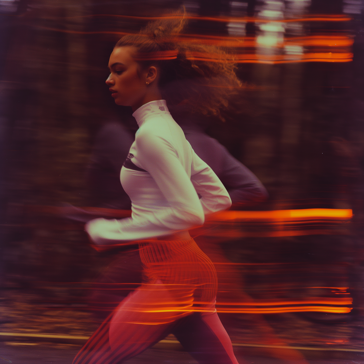 Dynamic shot of a woman running with motion blur and orange light streaks, highlighting speed and energy.