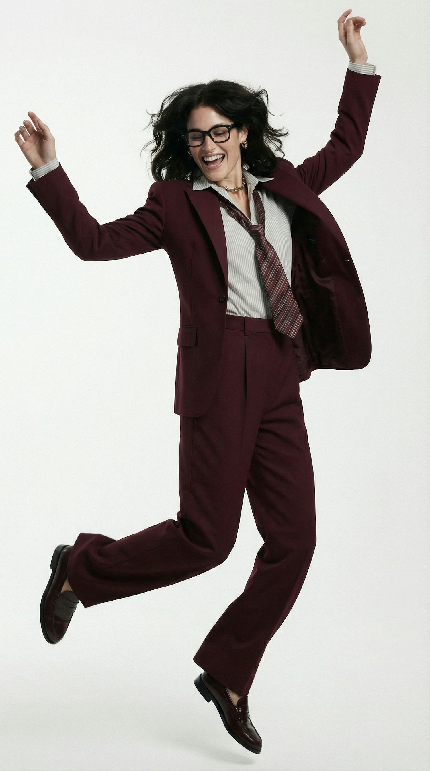 A person in a burgundy suit jumps joyfully against a white background, showcasing energy and style with a dynamic pose.