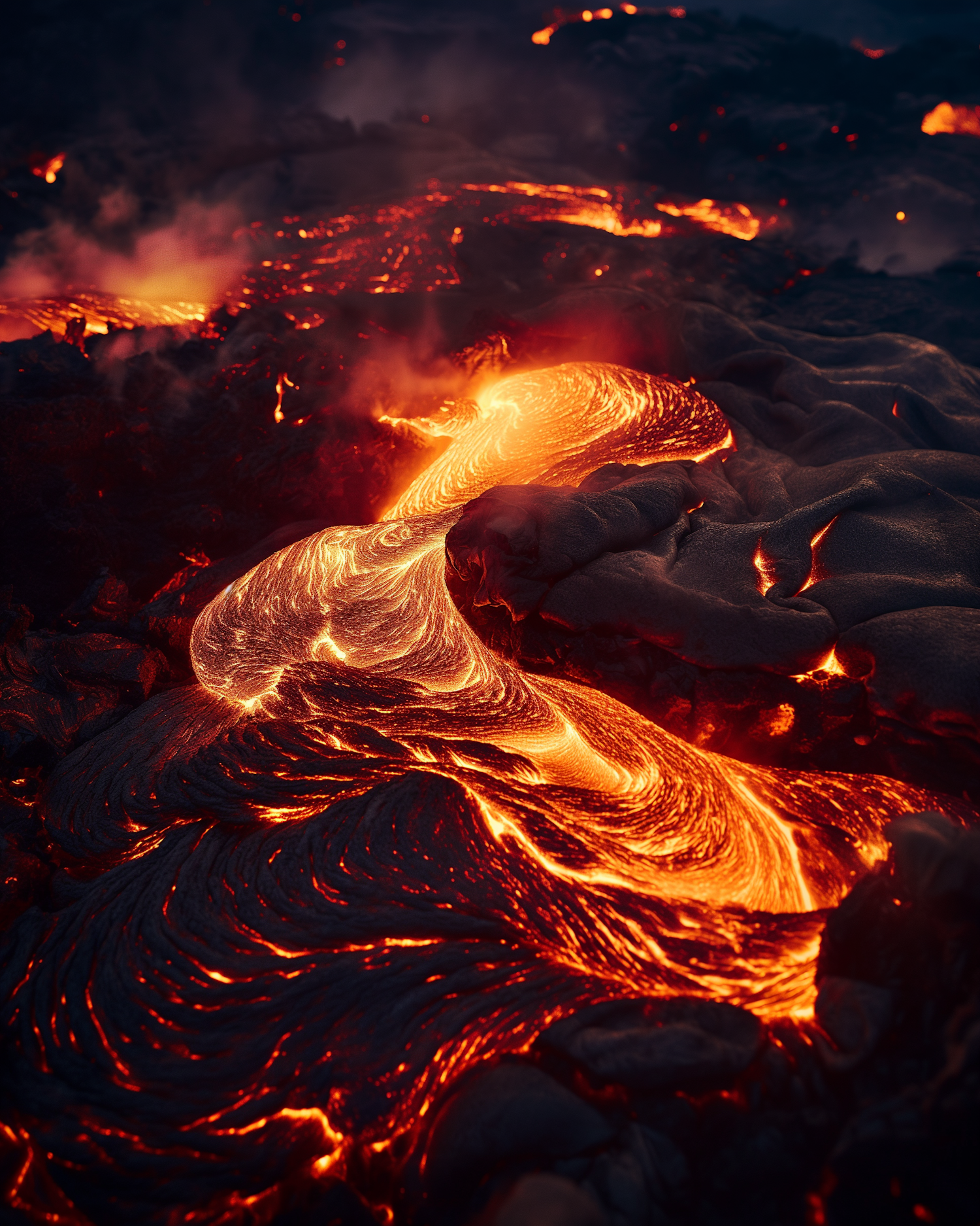 Vivid lava flow with glowing orange and red hues against dark rock, showcasing dynamic patterns and natural beauty.