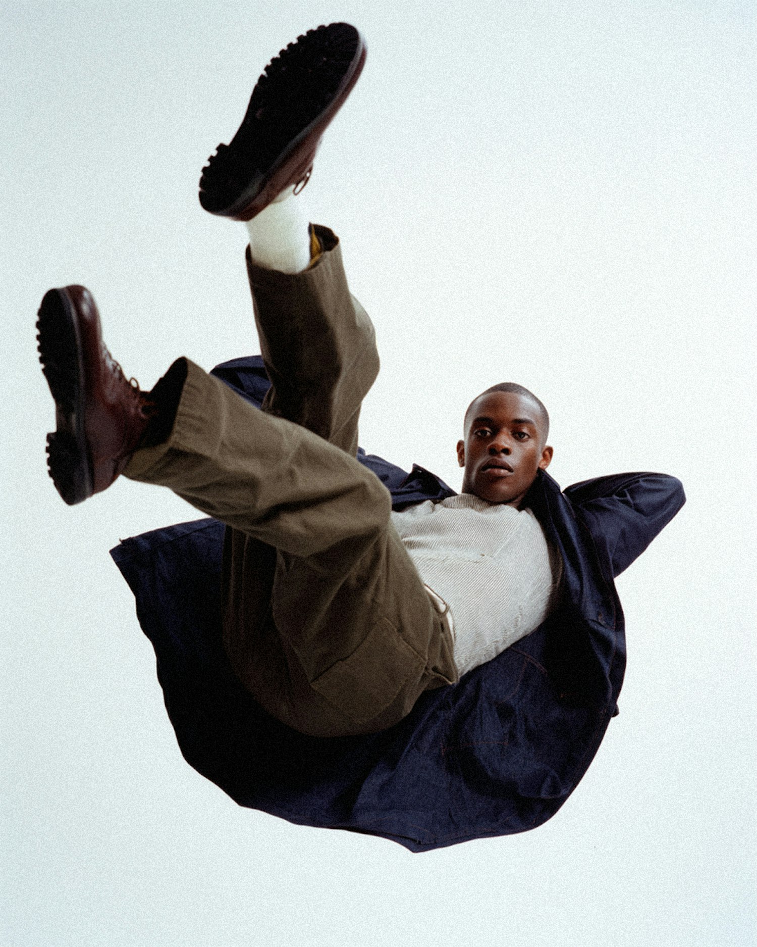 Dynamic shot of a person mid-air in stylish attire, featuring a dark coat, khaki pants, and boots, set against a clean background.