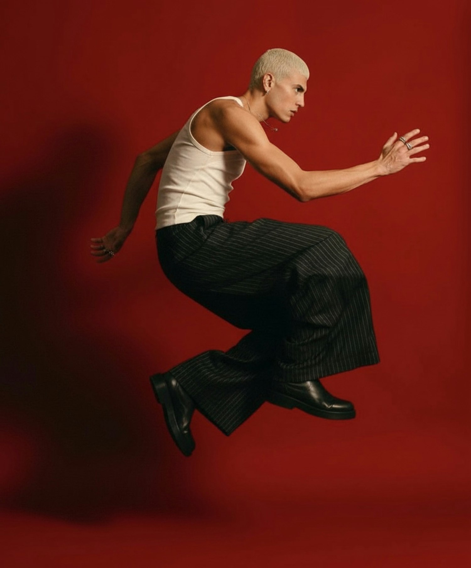 Dynamic shot of a person mid-leap in stylish attire against a bold red background, showcasing motion and energy.