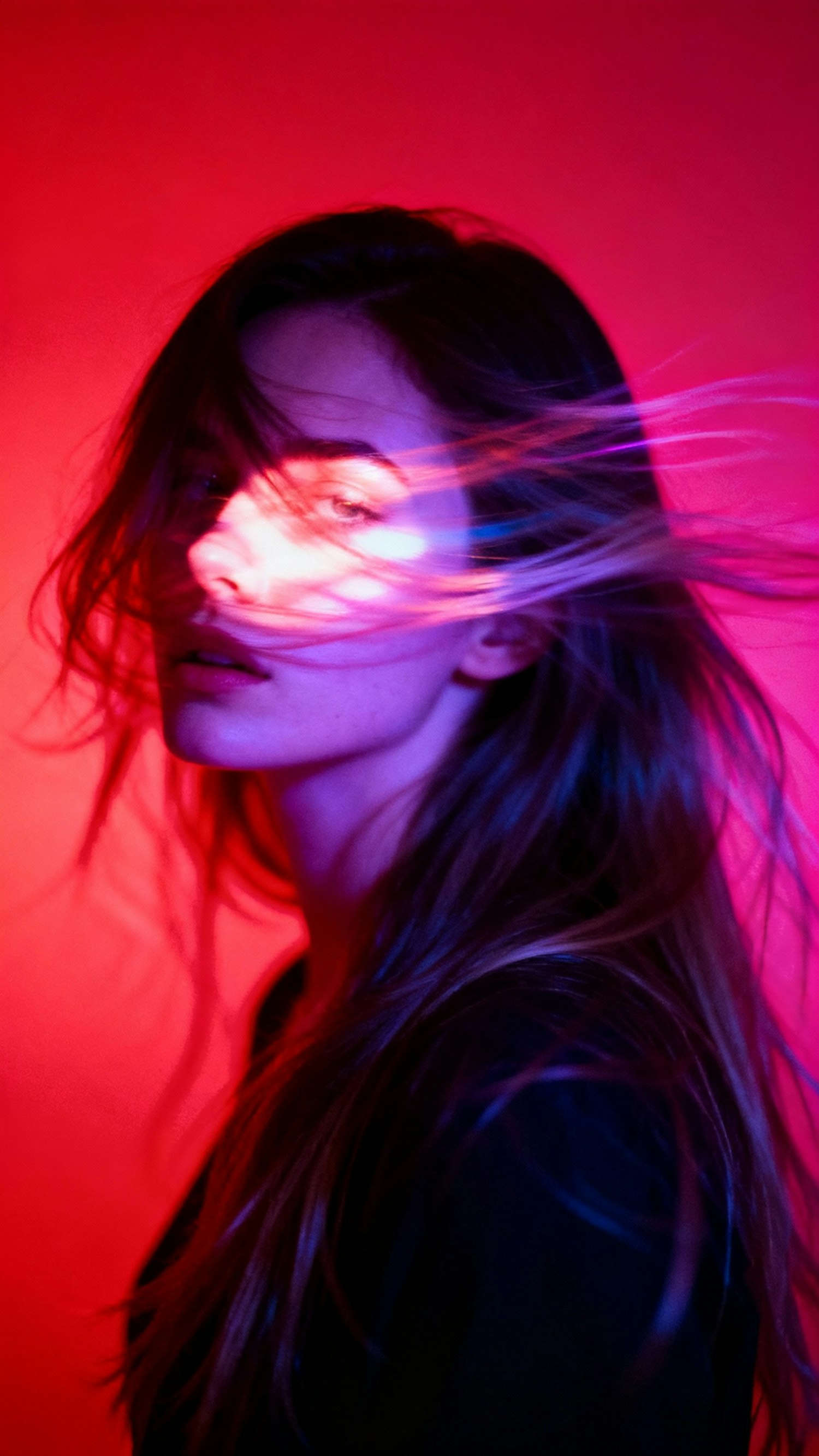 A vibrant portrait with dynamic lighting in red and purple tones, featuring a person with flowing hair and a dramatic background.