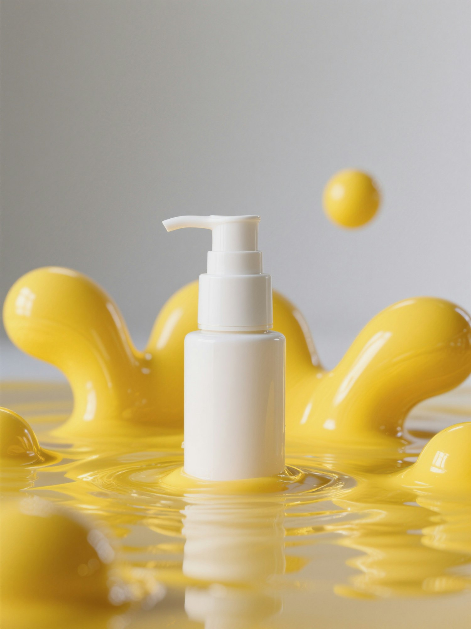 studio shot of a cosmetic product with blank, unbranded packaging, no label, no text, no design, stylized composition, vibrant colors, soft shadows, clean lighting, playful art direction, surreal inflated shapes, harmonious modern aesthetic — a pump bottle half-sunk in a pool of glossy yellow inflated liquid