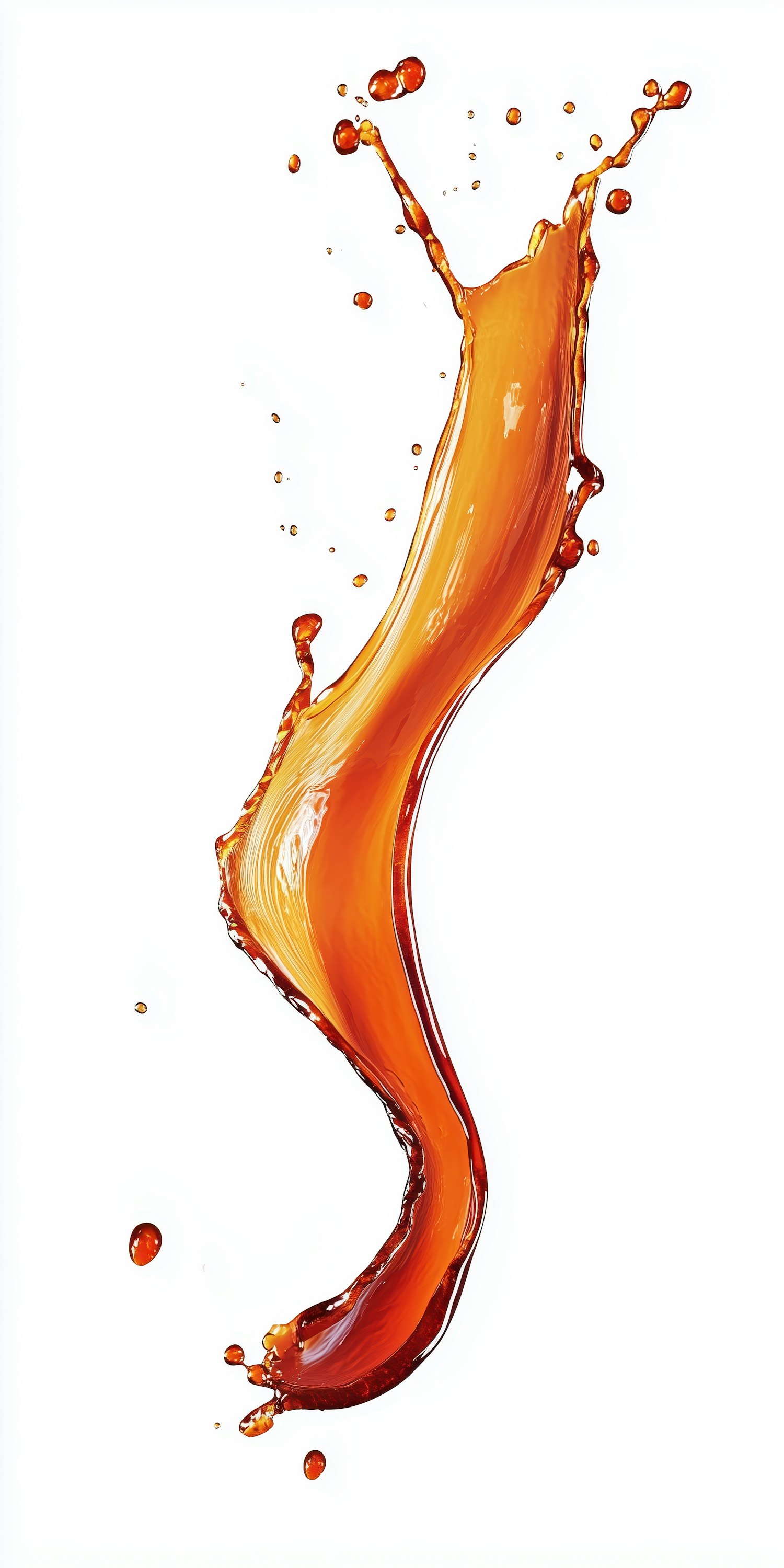 Vibrant orange liquid splash captured mid-air against a white background, showcasing dynamic motion and glossy texture.