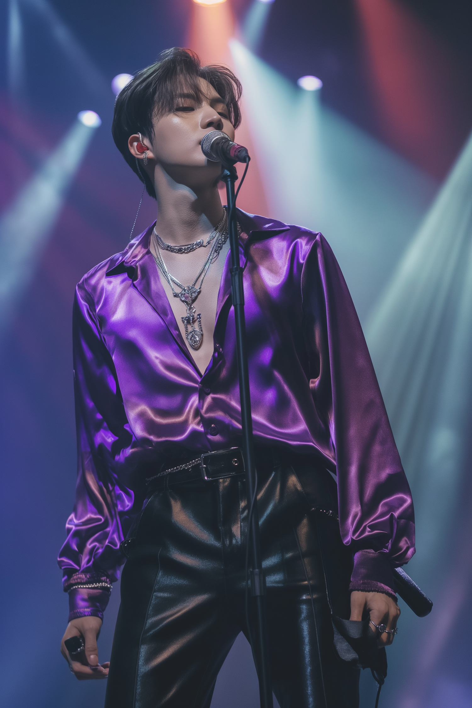 Asian male performer in purple satin shirt and leather pants, singing passionately on stage with colorful lights.