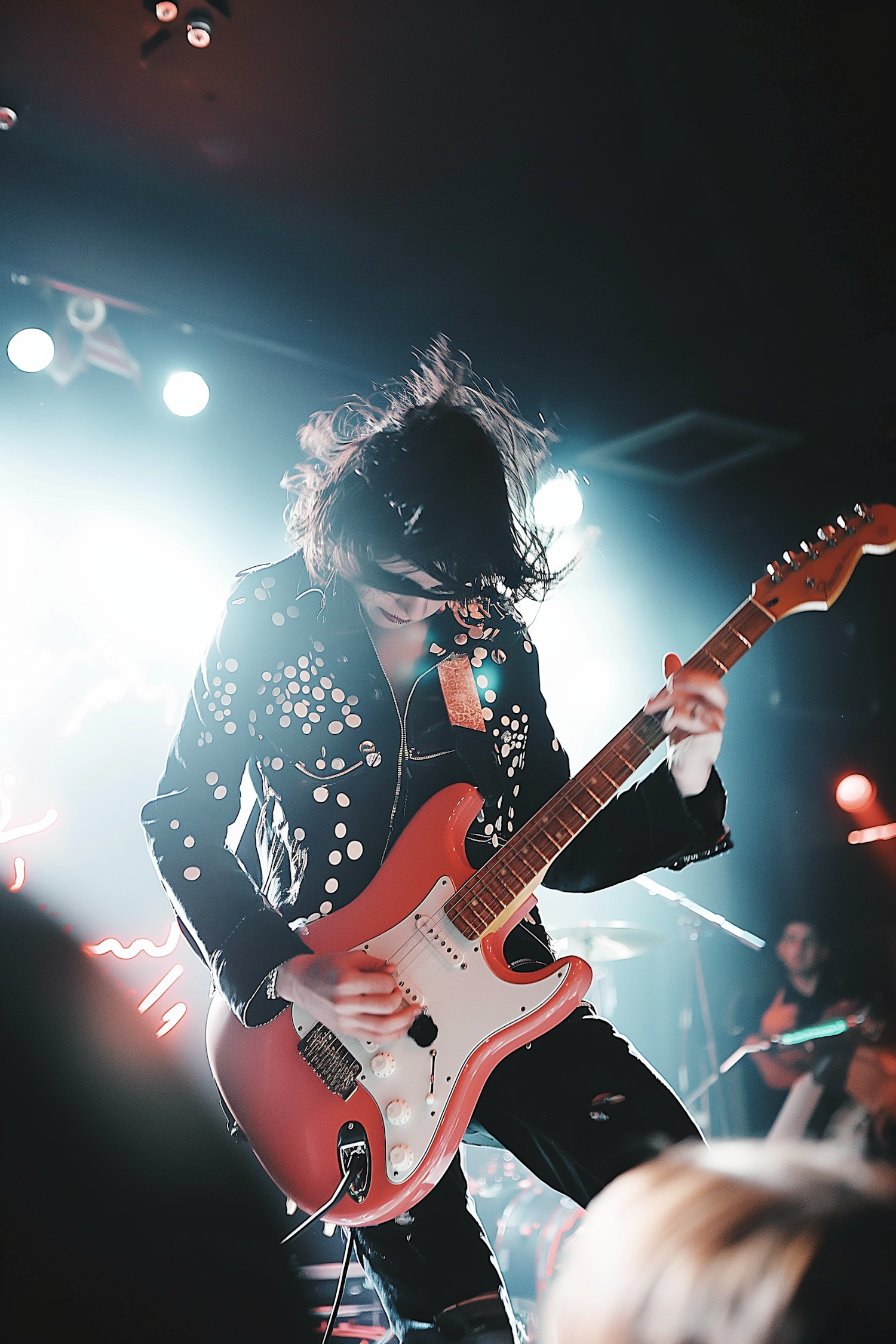 Rock guitarist in studded leather jacket performs passionately under dramatic stage lighting with a red electric guitar.