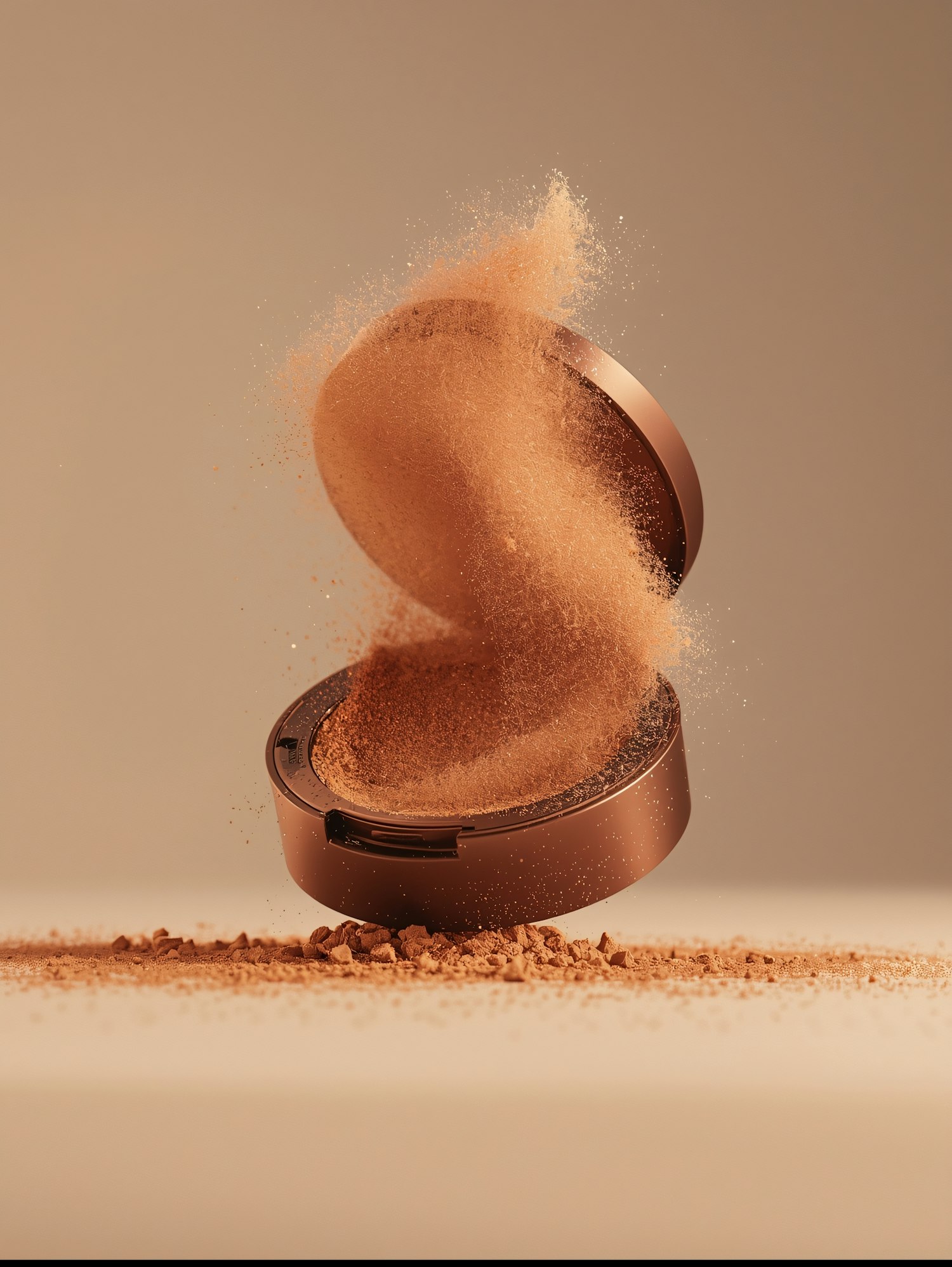 Dynamic shot of a bronze compact makeup case with powder bursting out, set against a neutral beige background for a clean aesthetic.