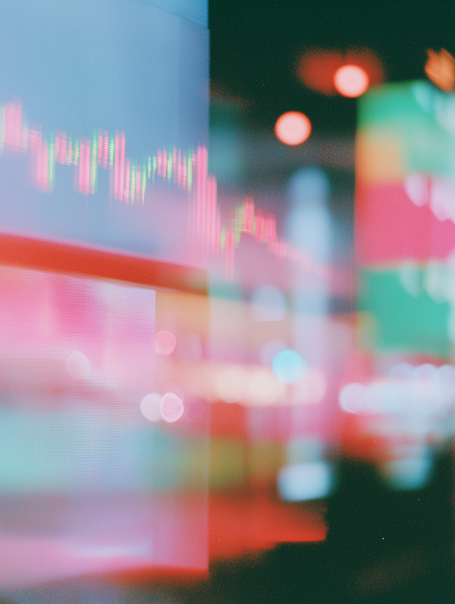 A vibrant and abstract depiction of stock market data with colorful graphs and bokeh lighting effects.
