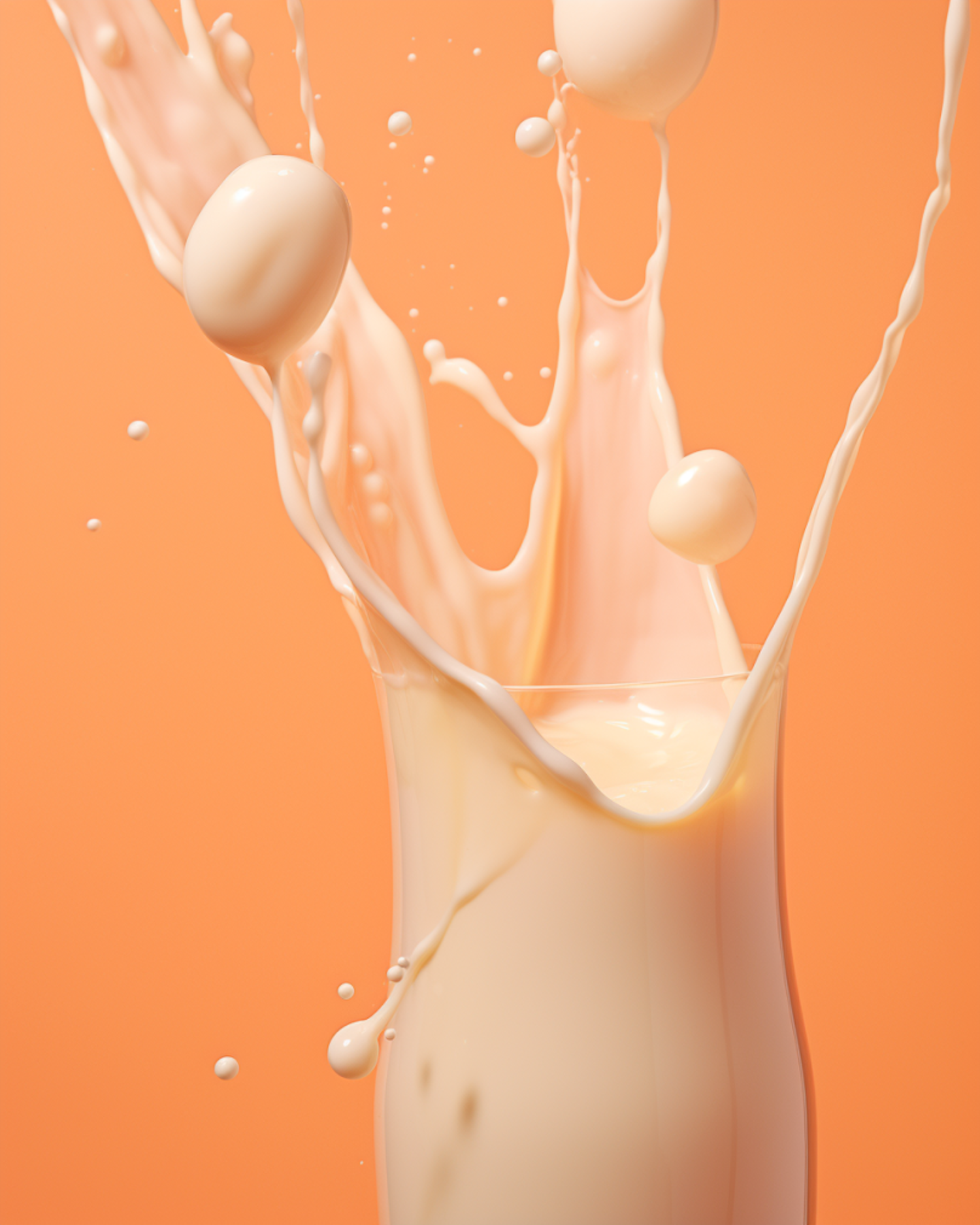 Creamy liquid splash captured mid-motion against a vibrant orange background, creating a dynamic and visually striking scene.