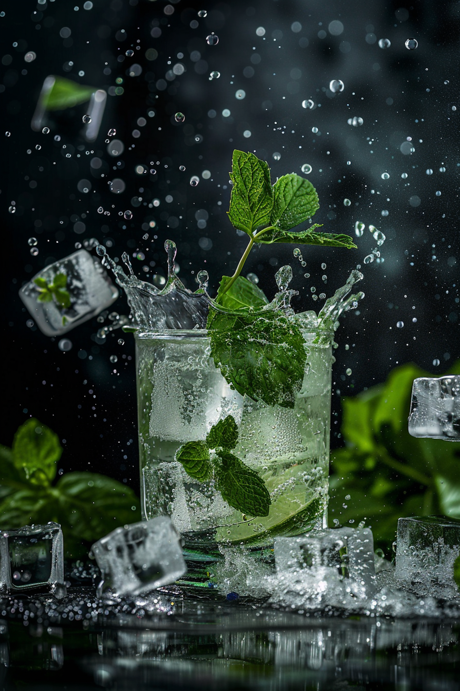 Refreshing cocktail with mint and ice cubes in mid-splash, set against a dark background, capturing a sense of freshness and motion.