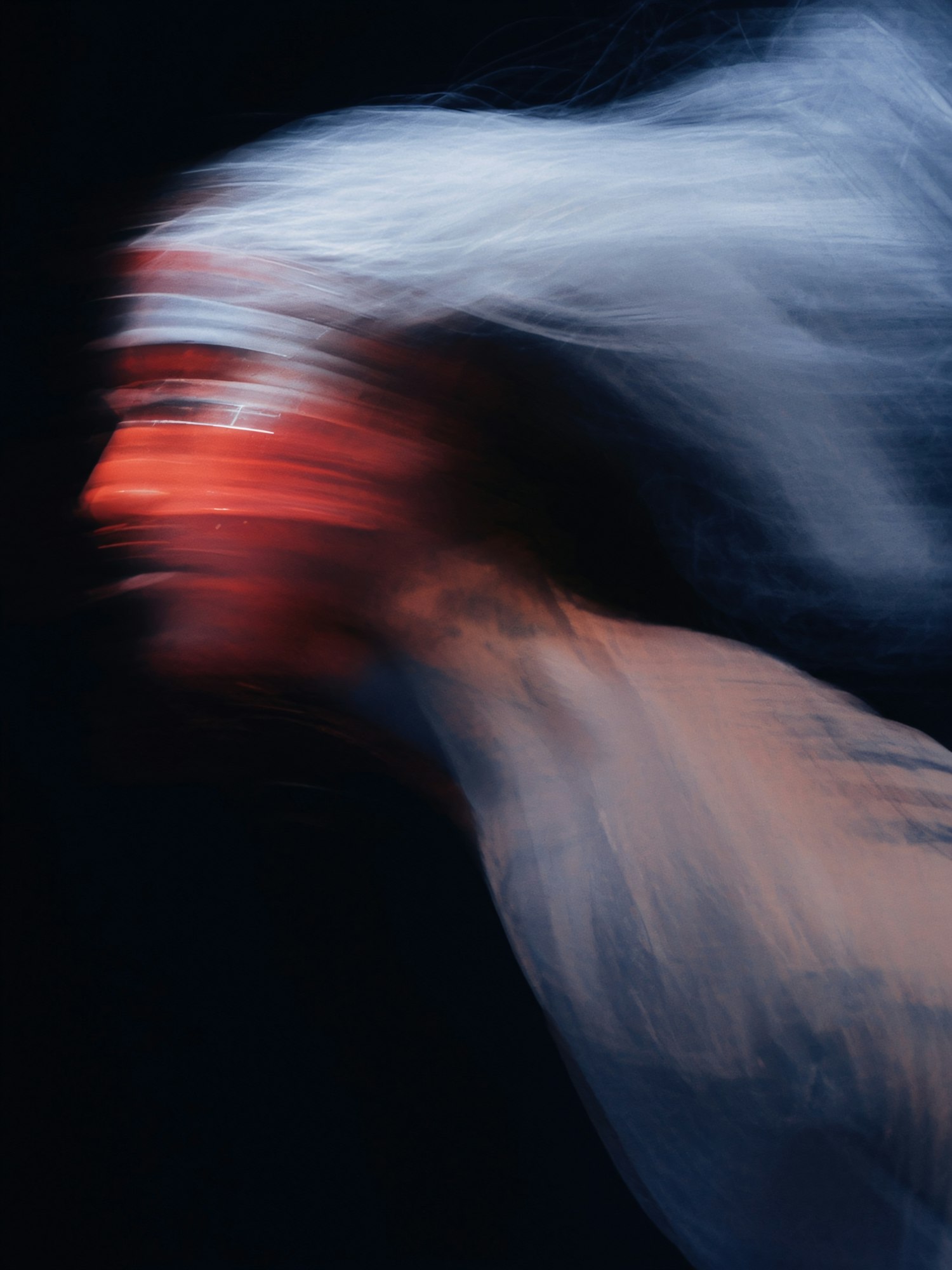 Abstract motion blur of a figure with red face paint and flowing white streaks, creating a dynamic and artistic visual effect.