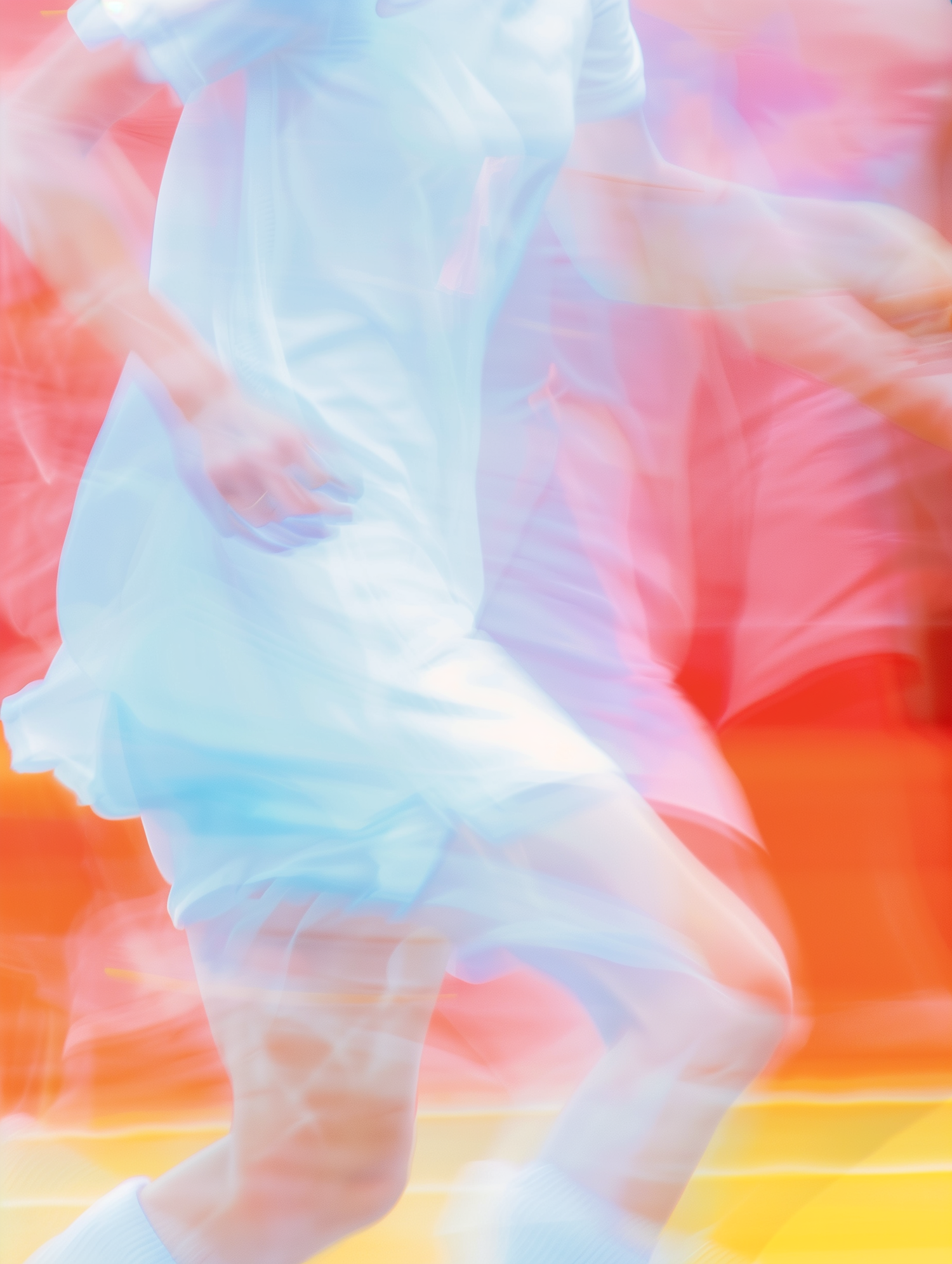 Abstract motion blur of a person in white sportswear against vibrant red and orange hues, creating a dynamic and energetic scene.