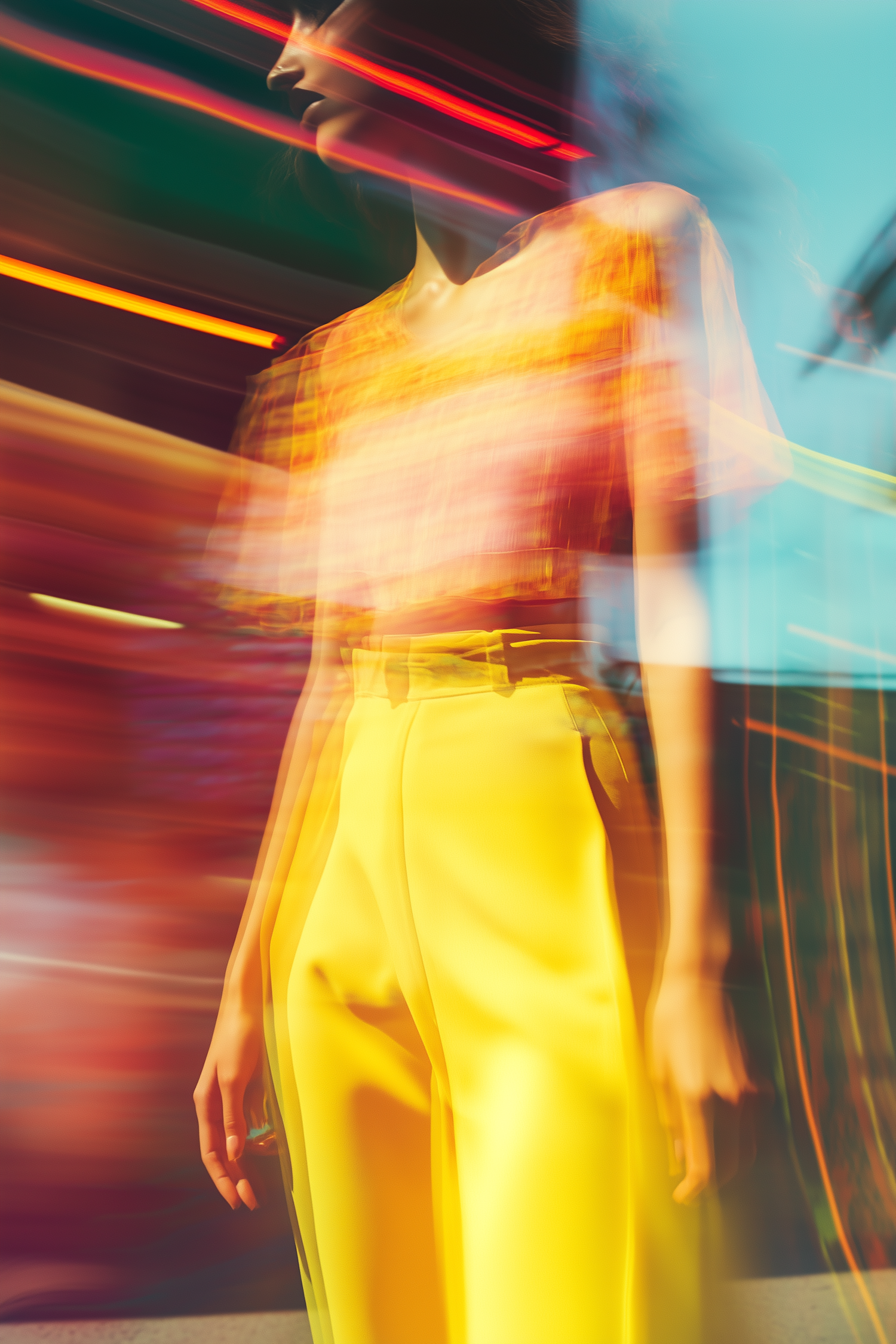 A dynamic shot of a woman in bright yellow pants, surrounded by colorful motion blur and streaks of light for a modern, artistic vibe.