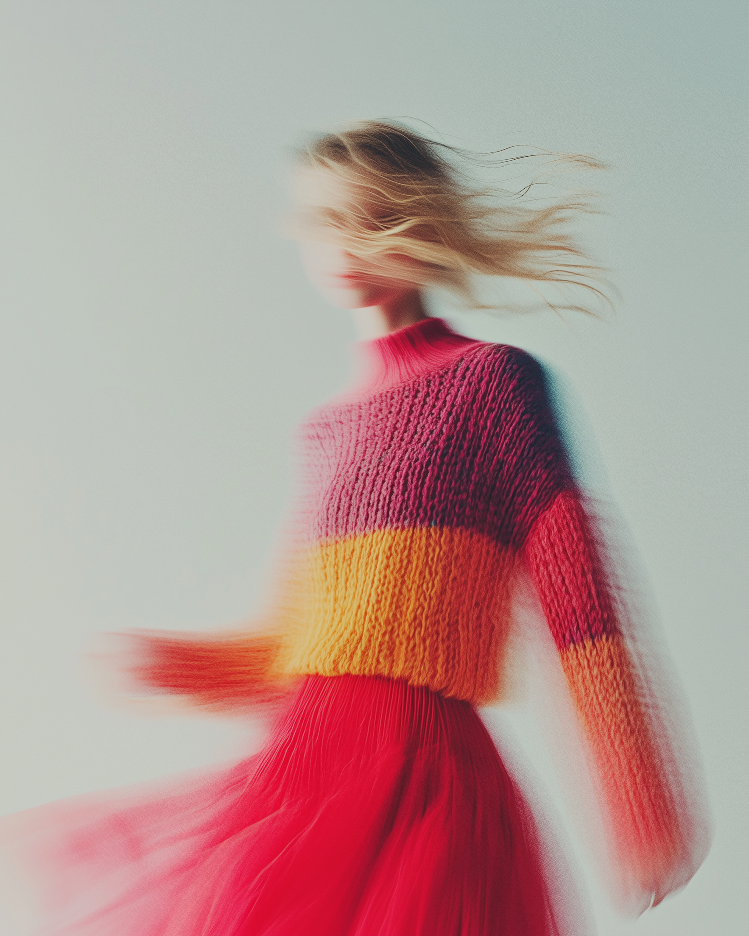 Blurred motion image of a person in a colorful striped sweater and red skirt, creating an artistic and dynamic effect.
