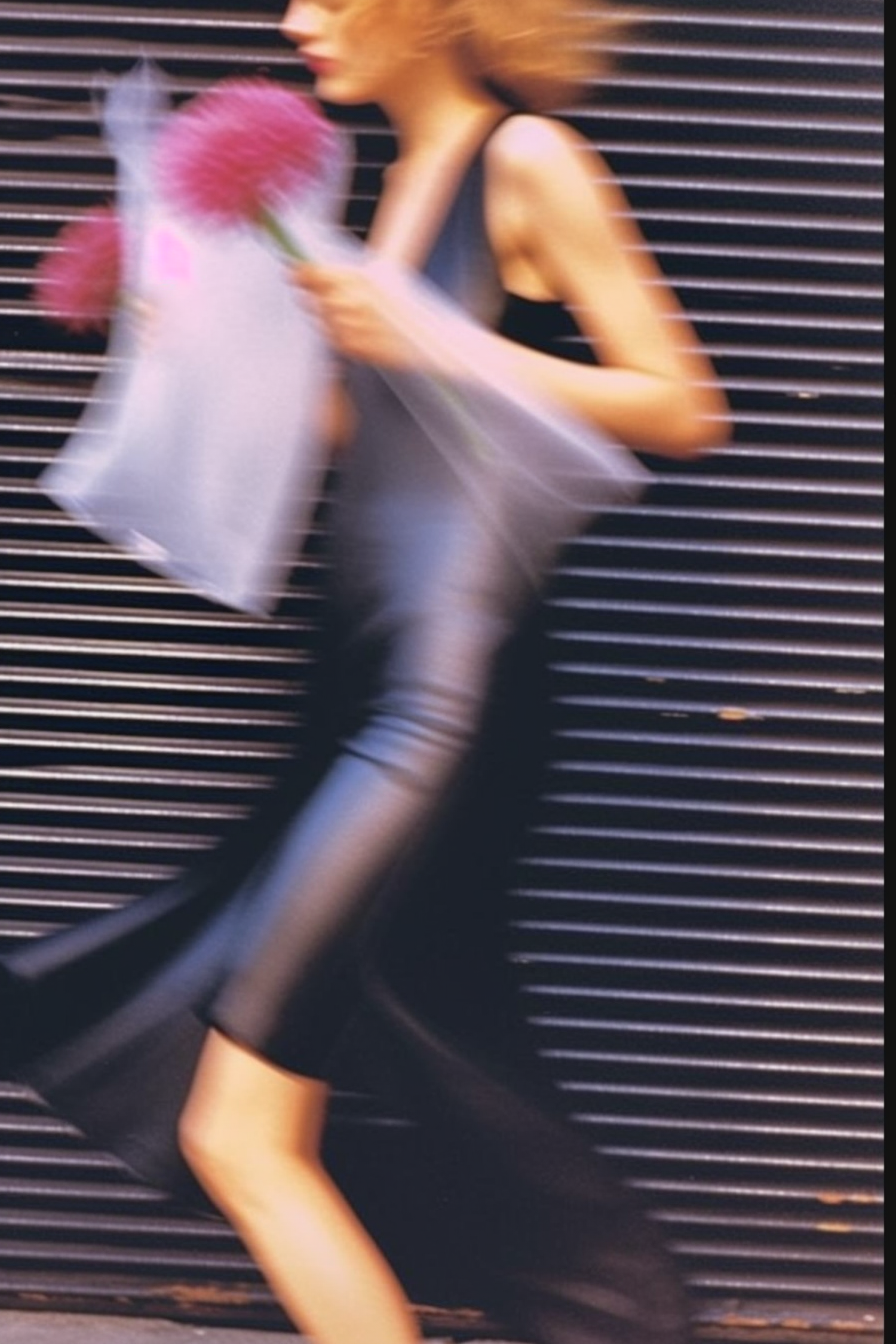 A dynamic shot of a person in a black dress holding pink flowers, with motion blur adding an artistic touch against a modern urban backdrop.