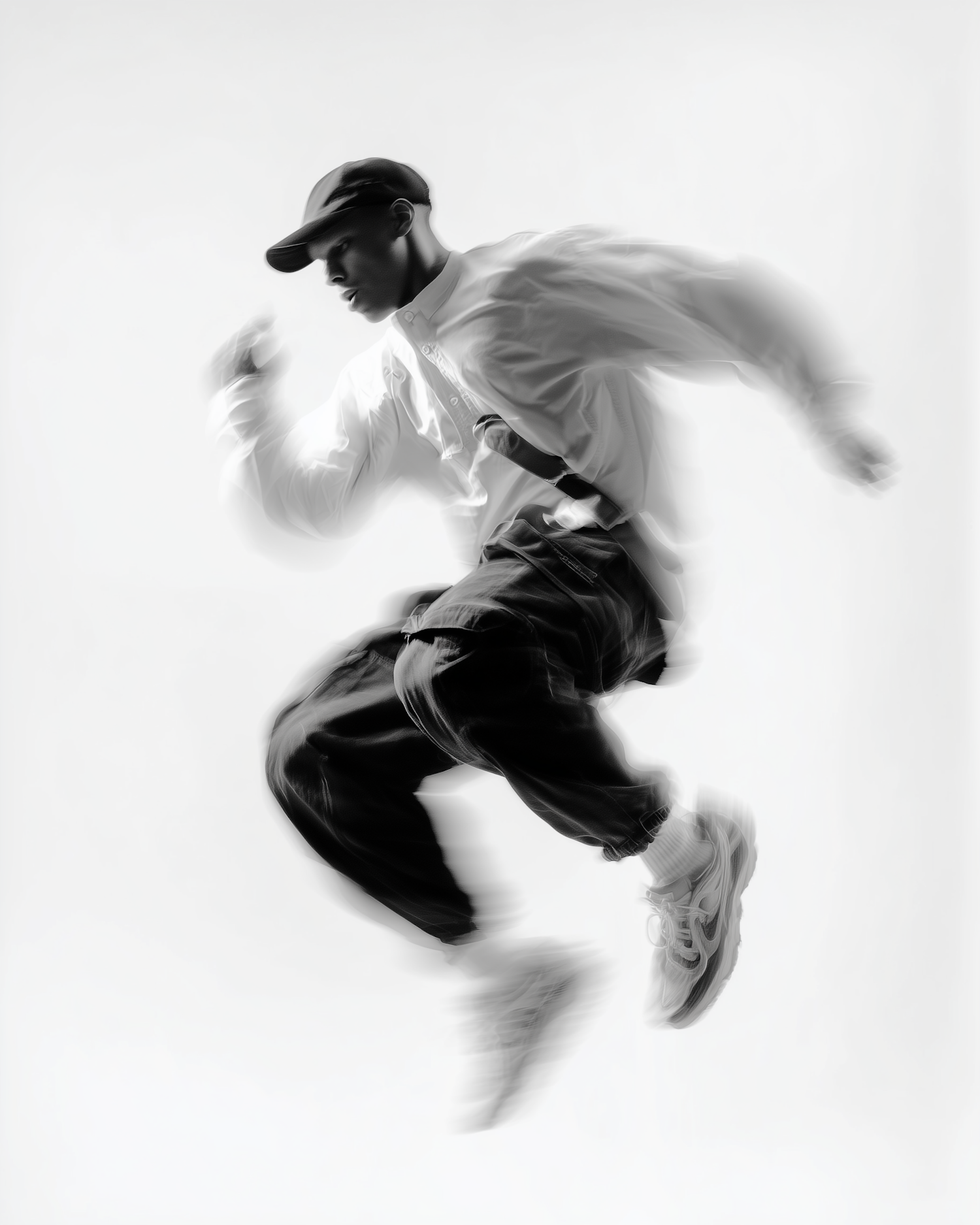 Black-and-white photo of a person in motion, wearing a cap, shirt, pants, and sneakers, with a dynamic blur effect emphasizing movement.