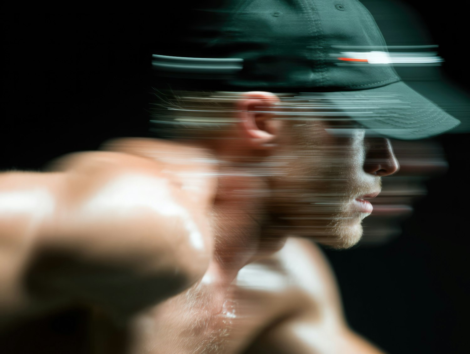 Dynamic motion blur of a person in a dark green cap, emphasizing energy and movement with a dark contrasting background.