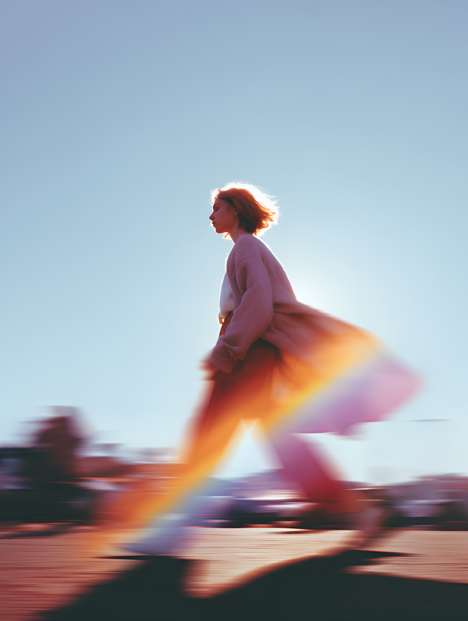 A dynamic shot of a person in motion under a clear sky, with vibrant light effects and a sense of freedom and energy.