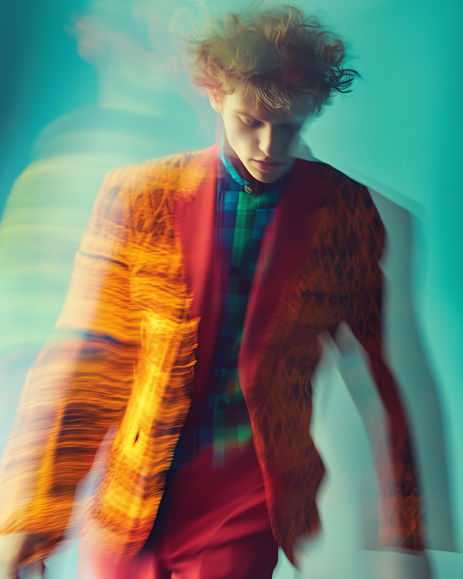 Dynamic motion blur of a young man in vibrant orange and red attire against a teal background, creating a sense of movement.