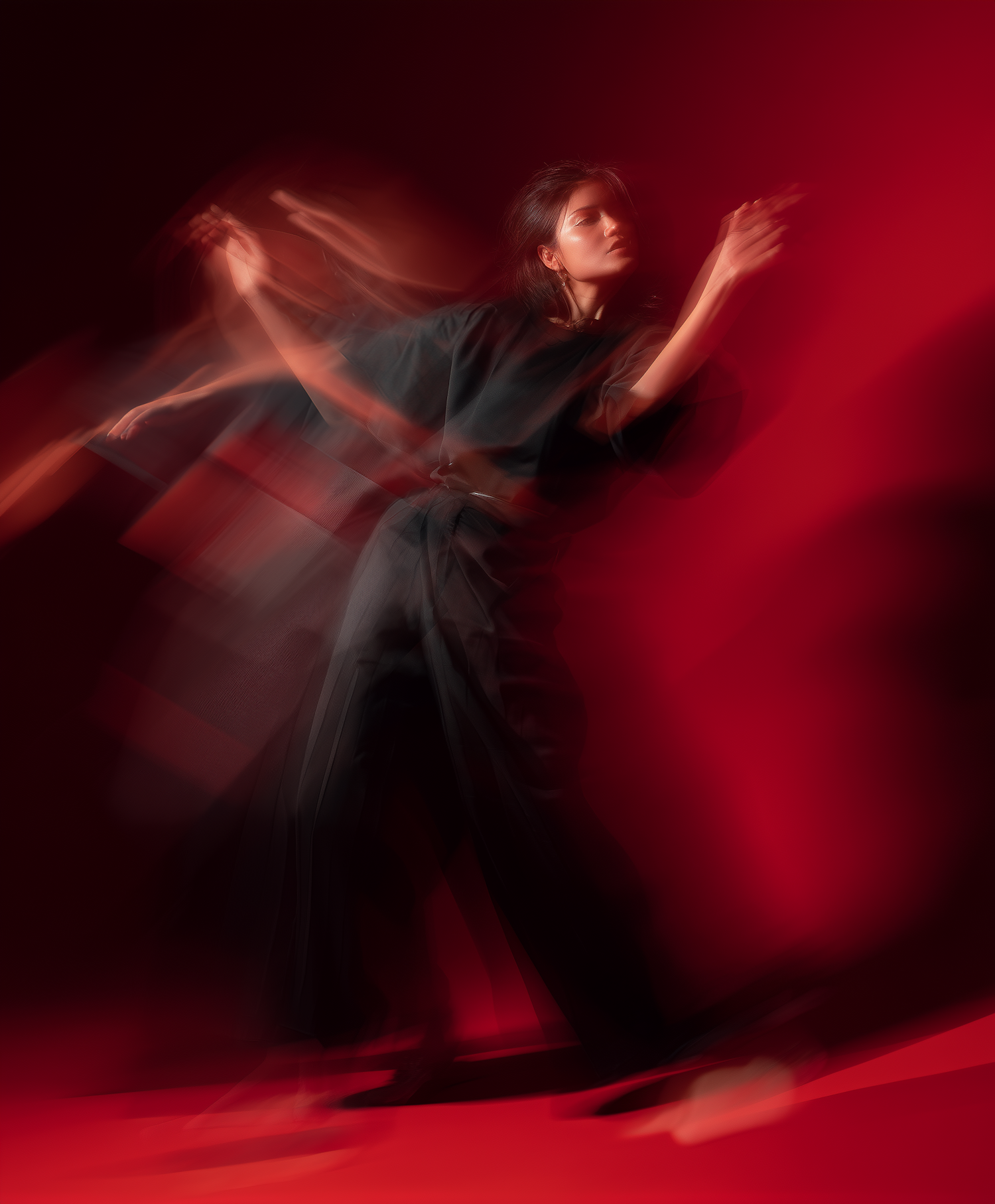 A dynamic long-exposure shot of a person in motion against a vivid red background, creating a fluid and artistic visual effect.