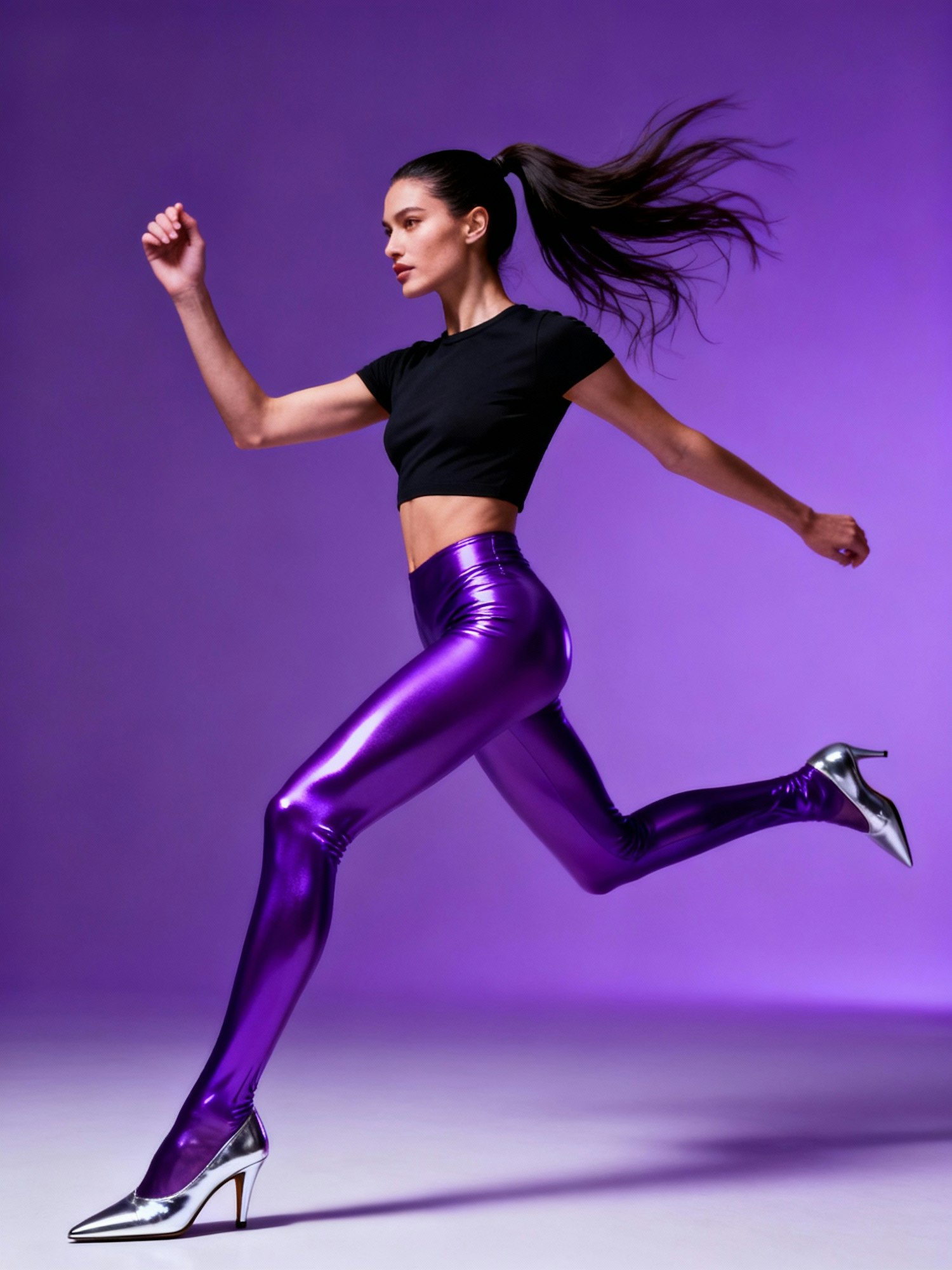 Editorial fashion photography, studio photoshoot, dramatic studio lighting, high-end fashion magazine style, sharp details, focus on avant-garde tights, bold styling, experimental composition, surreal editorial vibe. A dynamic shot of a female model captured mid-movement, one leg extended forward, arms creating bold diagonal lines. She wears electric purple glossy tights paired with a minimal fitted top and metallic pointed heels. Hair styled in a sleek ponytail flying slightly with motion. The background and floor are a seamless electric purple studio backdrop, perfectly uniform with no horizon line. Strong directional lighting accentuates movement, bold editorial vibe.