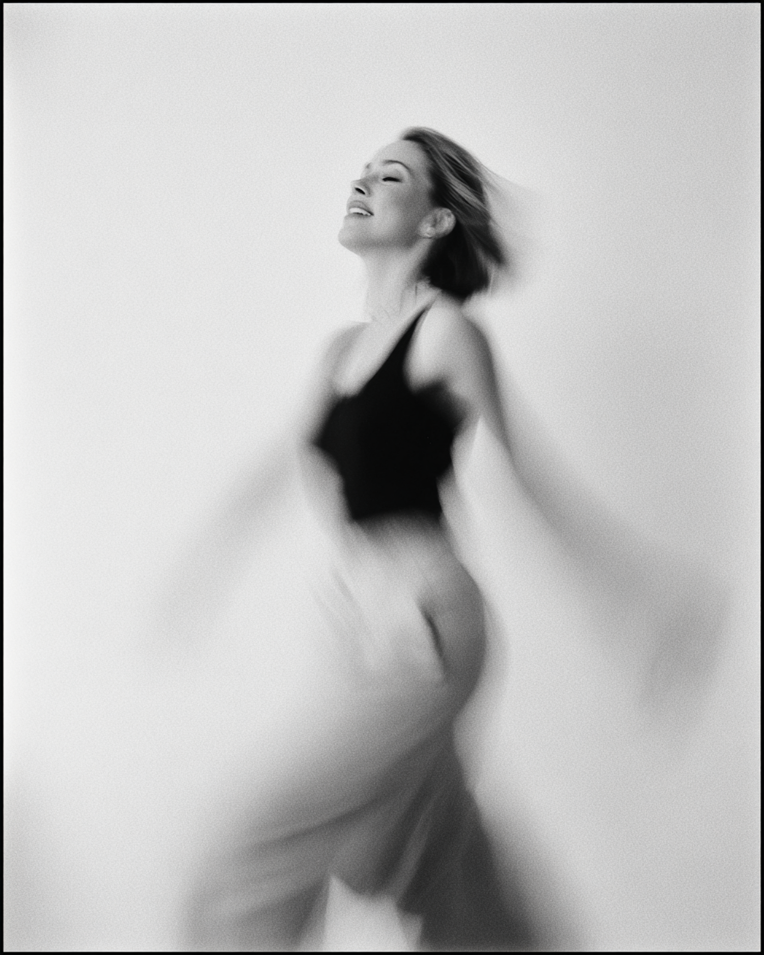 A captivating black-and-white motion blur photograph of a woman dancing energetically.