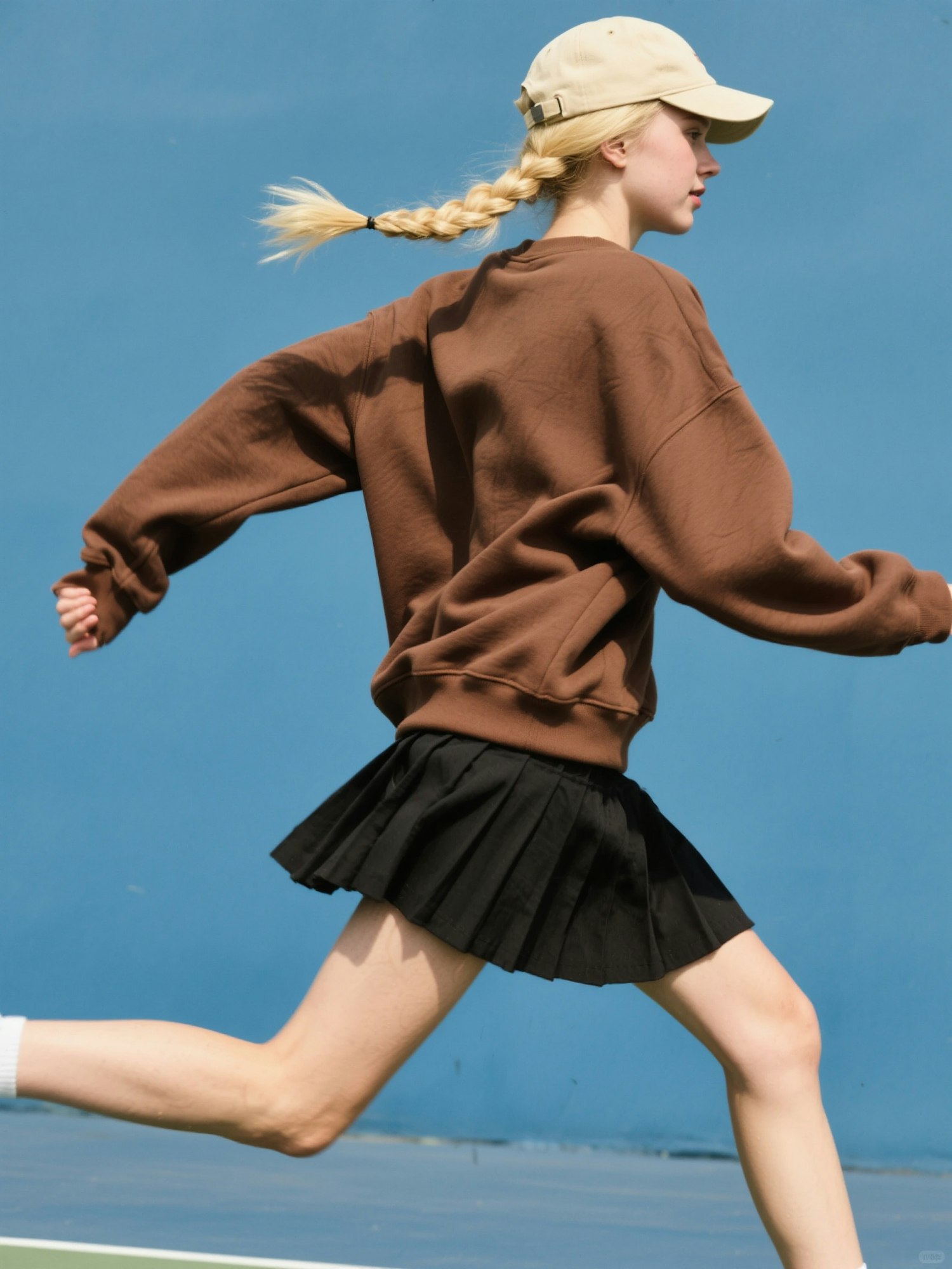 Dynamic outdoor fashion photograph of a young blonde woman in motion, captured from behind as she makes a large stride, creating a sense of energy and movement. She is wearing a plain brown crewneck sweatshirt with long sleeves, minimalist design, no text, no logo. The sweatshirt has a slightly oversized fit, draping naturally with folds that emphasize the action. She pairs it with a short black pleated tennis skirt, replacing the shorts, giving the look a sporty yet feminine style. Her long blonde hair is styled in a braid that swings outward with her movement, and she wears a beige baseball cap. The framing captures her from mid-back to mid-thigh, focusing on the dynamic lines of the clothing and the stride. The background is a clean, deep blue surface, providing a striking contrast to the brown sweatshirt and black skirt. The direction is editorial and sporty, with a crisp, modern atmosphere and sharp natural daylight that highlights textures and motion