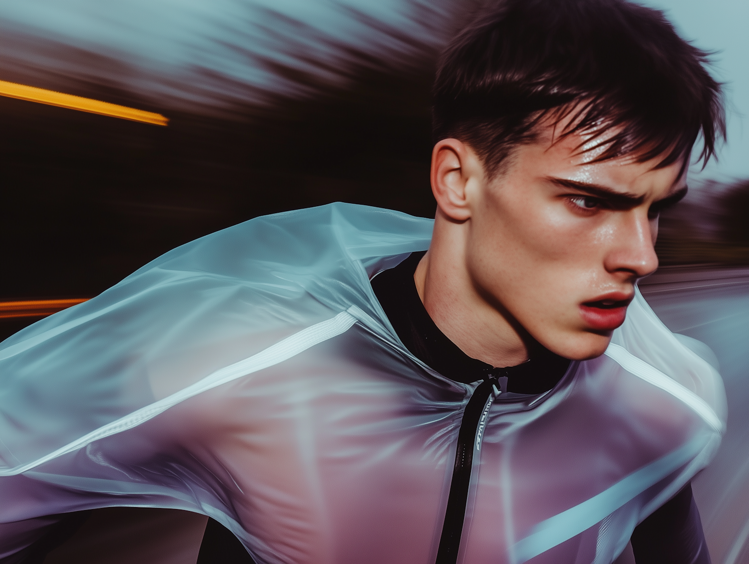 A focused young man in a translucent jacket captured in motion, with a blurred background emphasizing speed and determination.