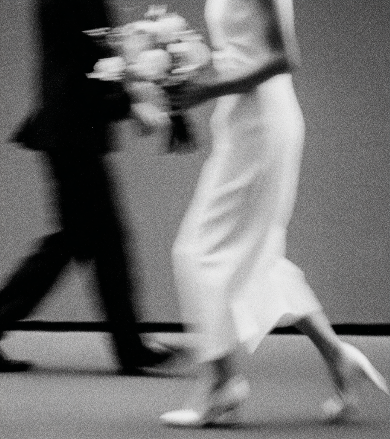 A blurred black-and-white photo of two people walking, one in a white dress holding flowers, the other in a dark suit, creating a dynamic scene.