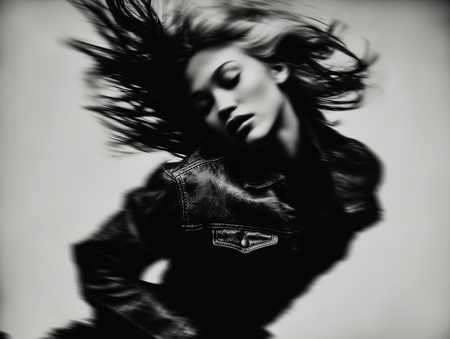 Dynamic black-and-white photo of a person in motion, wearing a leather jacket, with flowing hair and a blurred background.