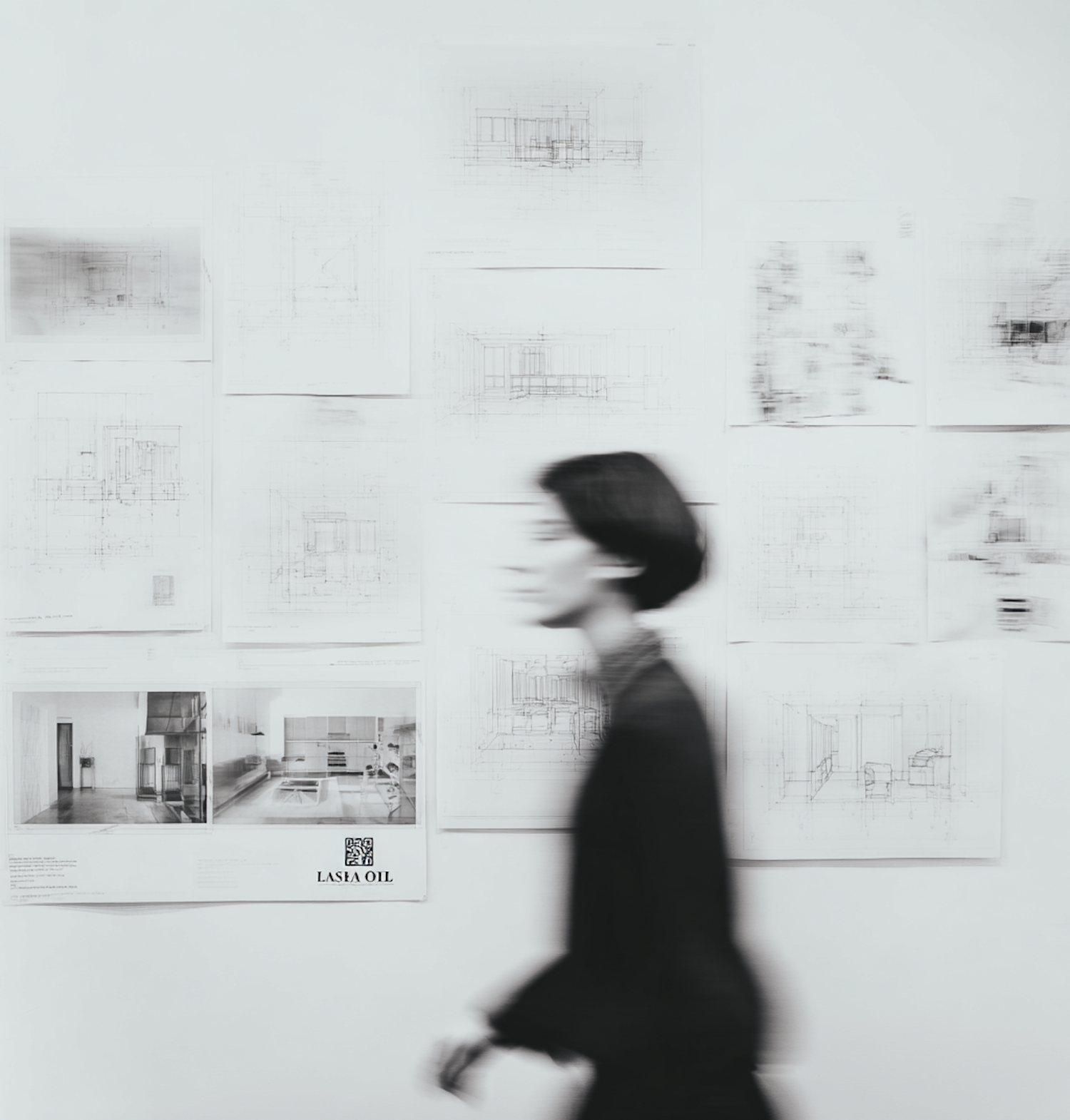 Blurry person walking past a wall of technical architectural drawings, emphasizing motion and design in a monochrome aesthetic.