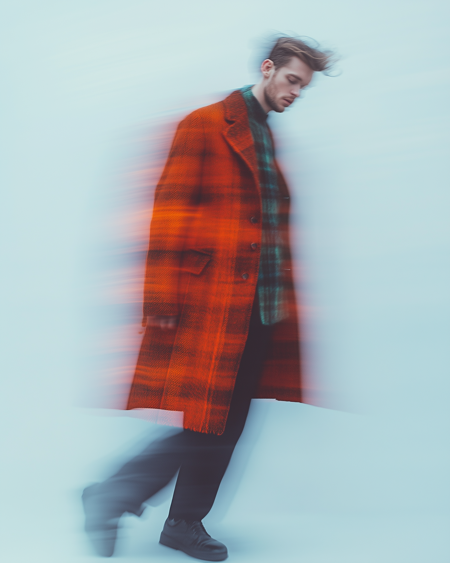 Artistic motion blur of a man in an orange plaid coat walking, creating a dynamic and fluid visual effect.