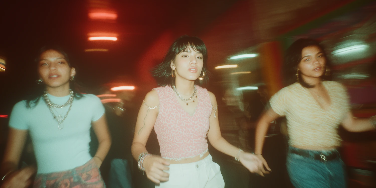 Three stylish women in motion, captured in a vibrant, blurred nightlife scene with bold outfits and accessories.