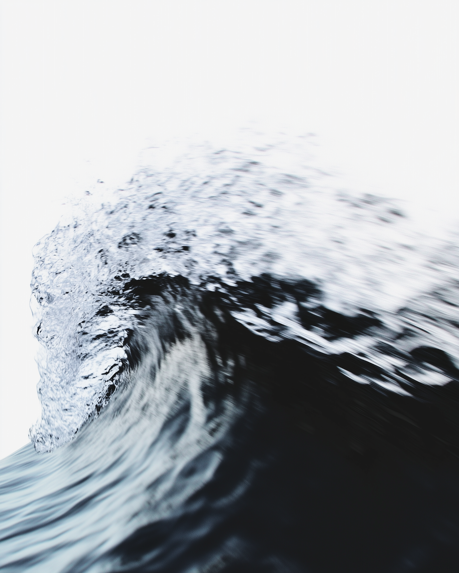 Close-up of a cresting wave with dark glossy water and frothy white crest, set against a bright minimal background.