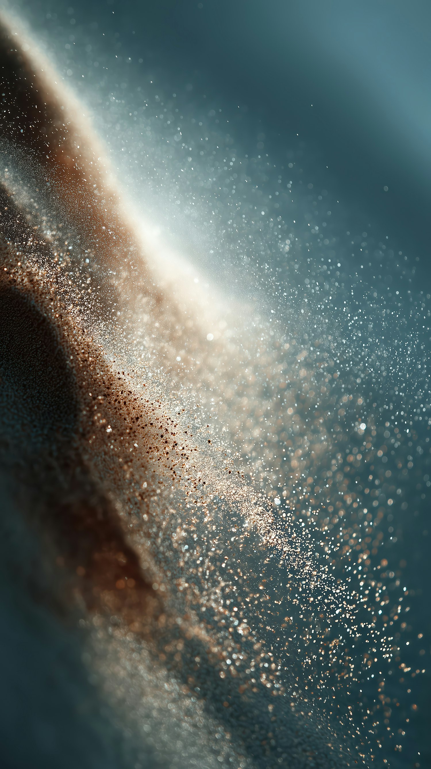 Abstract close-up of particles in motion, blending warm and cool tones with dynamic lighting for a mesmerizing visual effect.