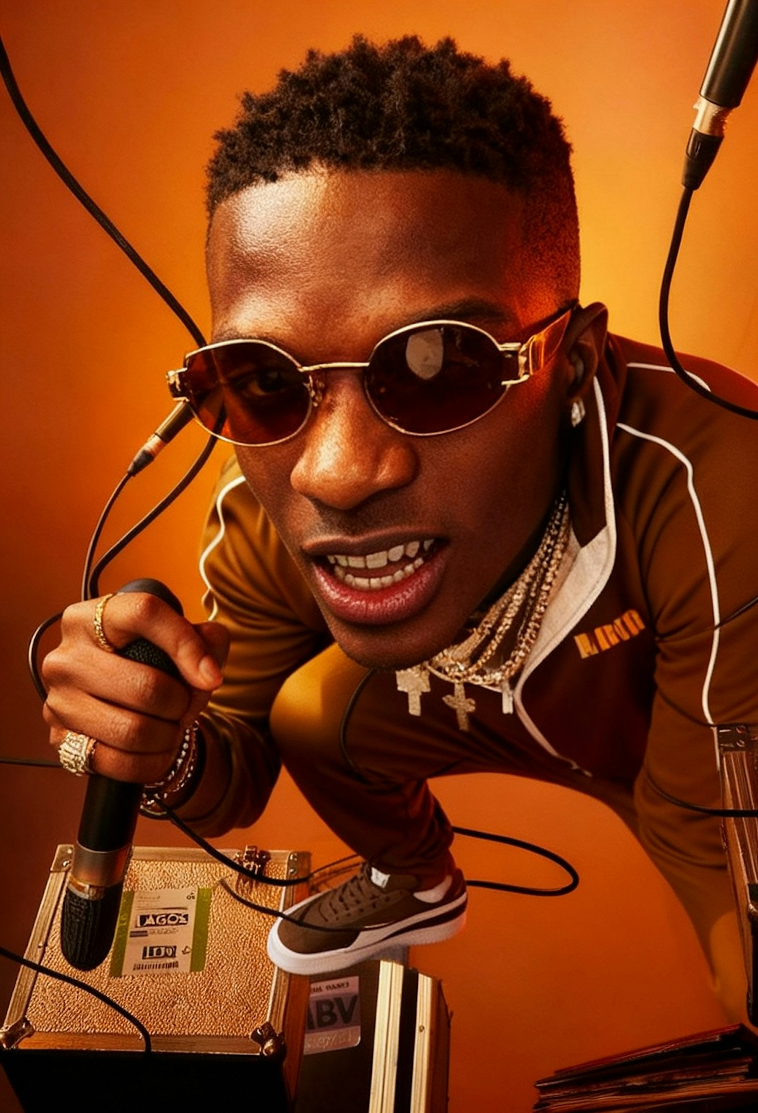A vibrant portrait of a stylish individual in a brown tracksuit, holding a microphone against an orange background.