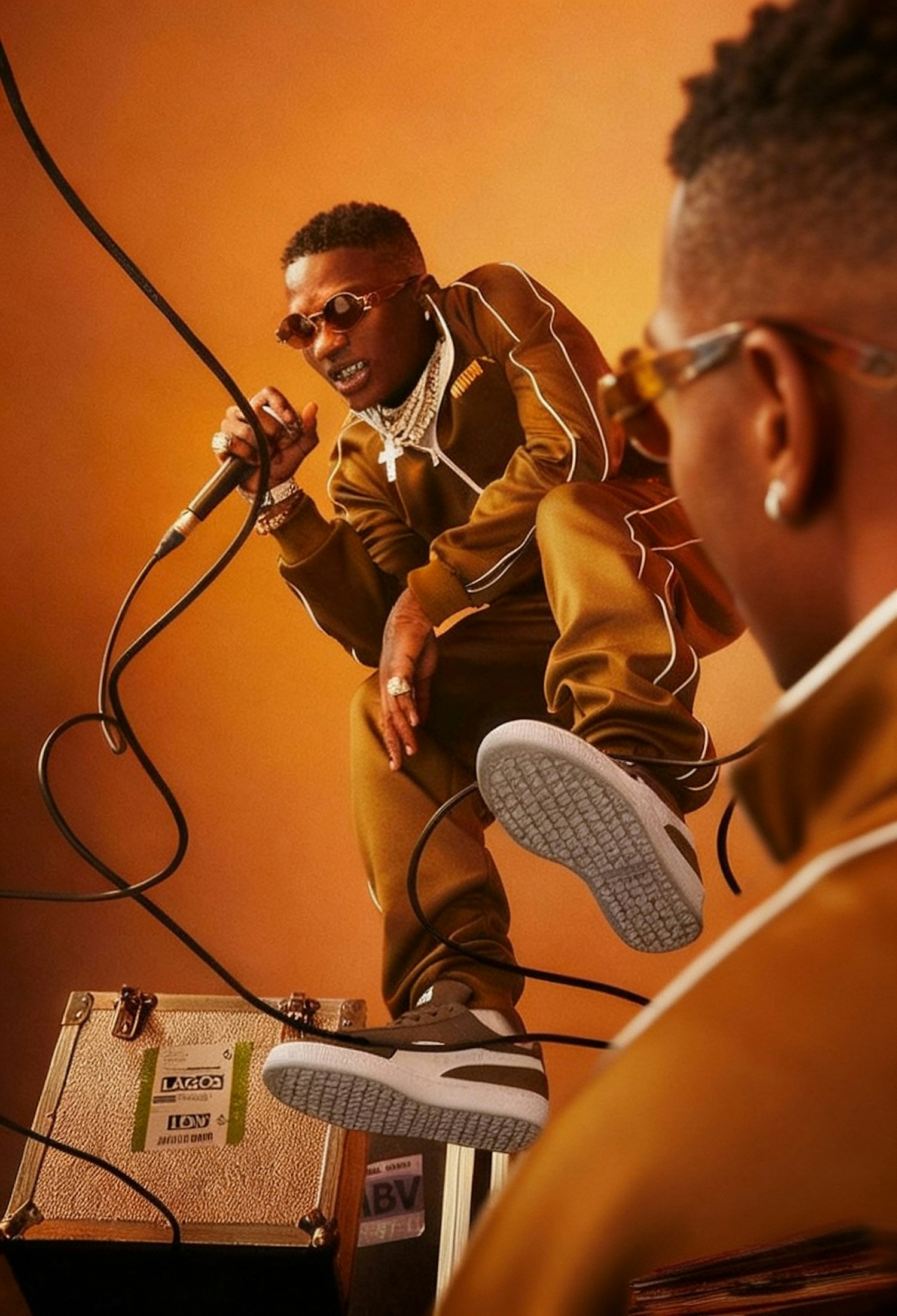A stylish individual in a tracksuit poses dynamically with a microphone, set against a warm orange background.