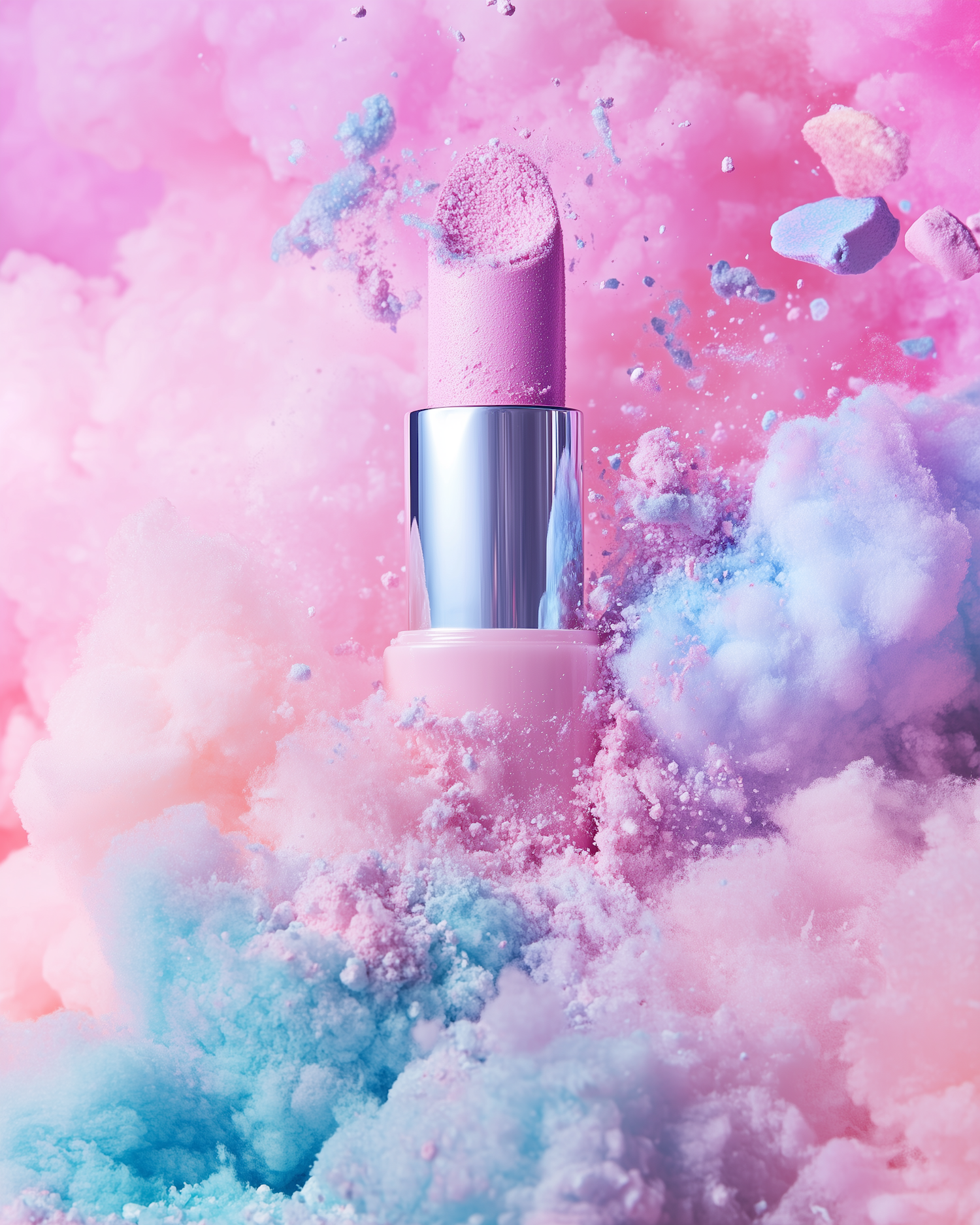 Pink lipstick amidst colorful clouds of powder, creating a dreamy and whimsical aesthetic with pastel hues and dynamic motion.